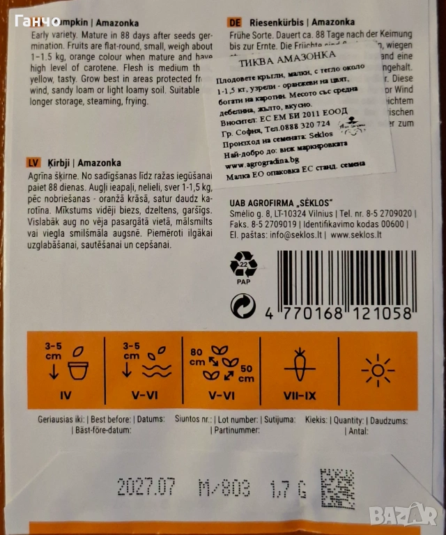 1.Семена за тиква Амазонка / Cucurbita Maxima Duchesne Amazonka -наличност 180бр. семена-20бр.-1 EUR