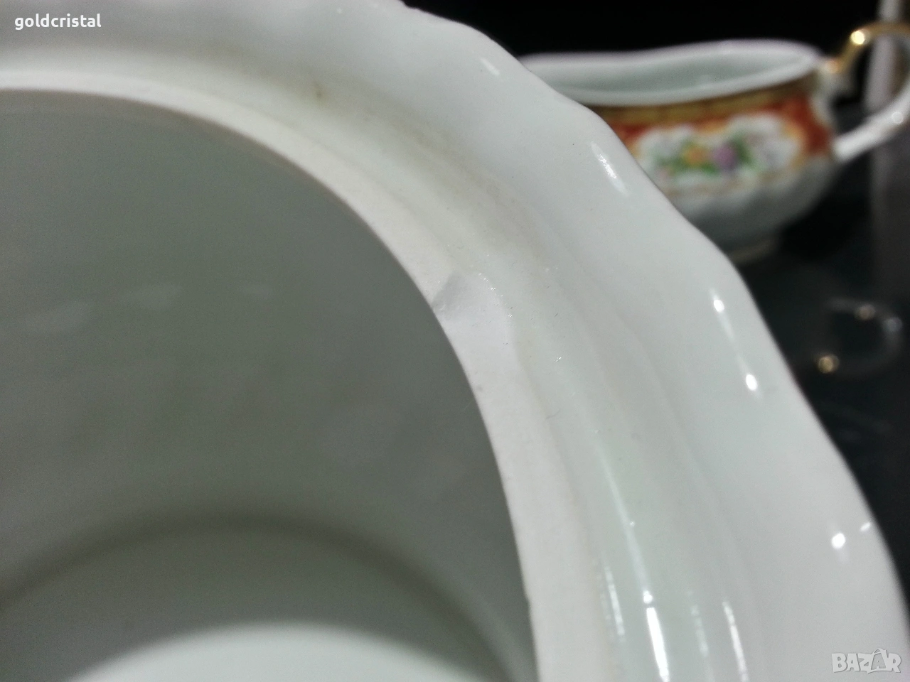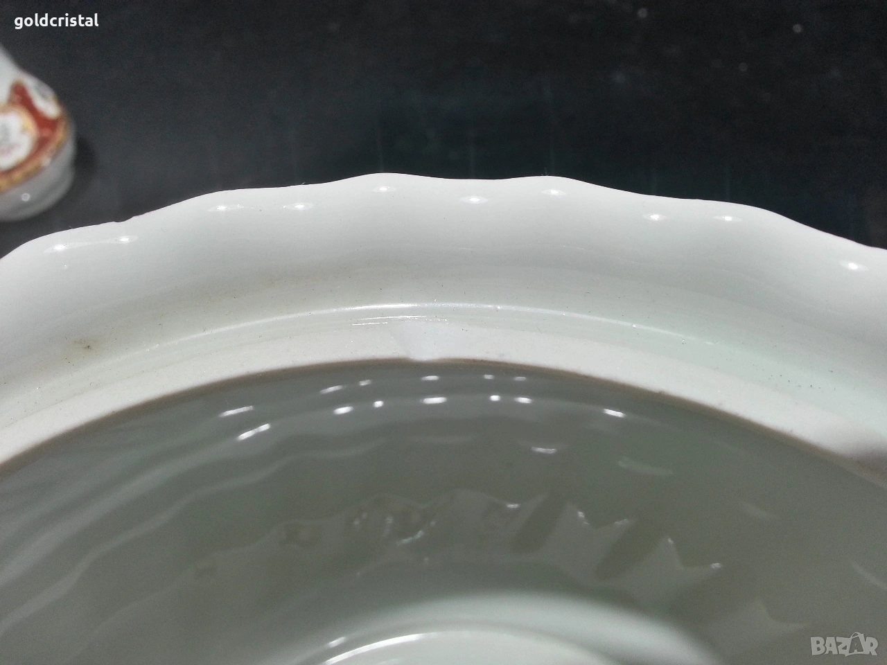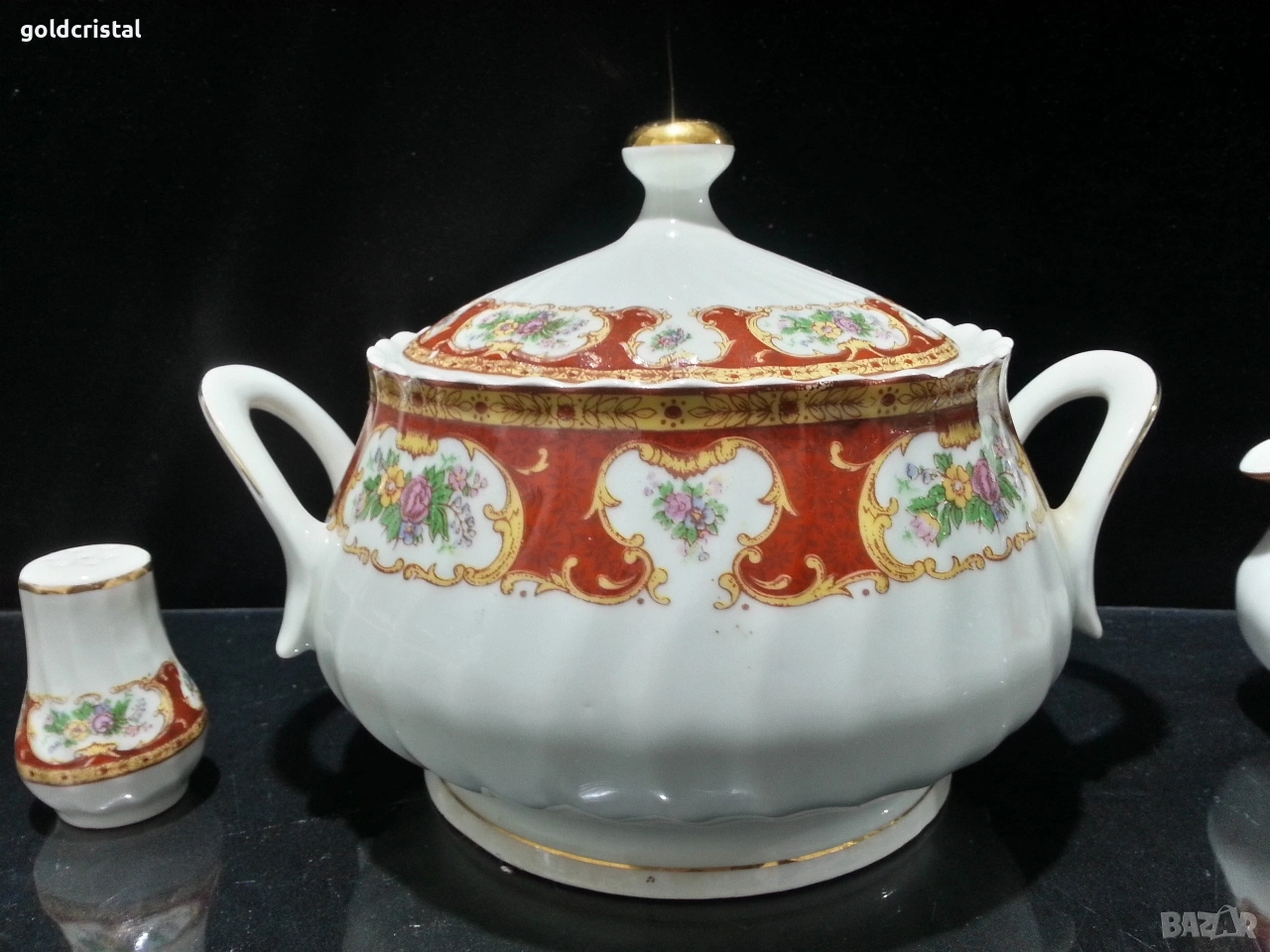 Стар български порцелан китка червен барок супник малък чип отвътре на борда 70€ сосиера 35€ солничка 2 бр-50€ сервиз комплект сет лот ретро арт декор винтидж колекция стари старинни антикварни предмети обзавеждане за дома и семейството подходящи за подарък за ценители и колекционери