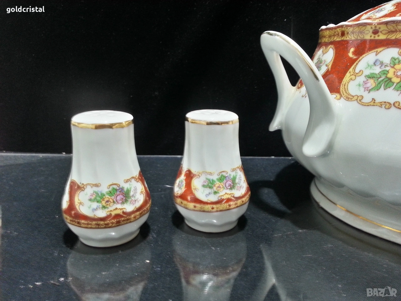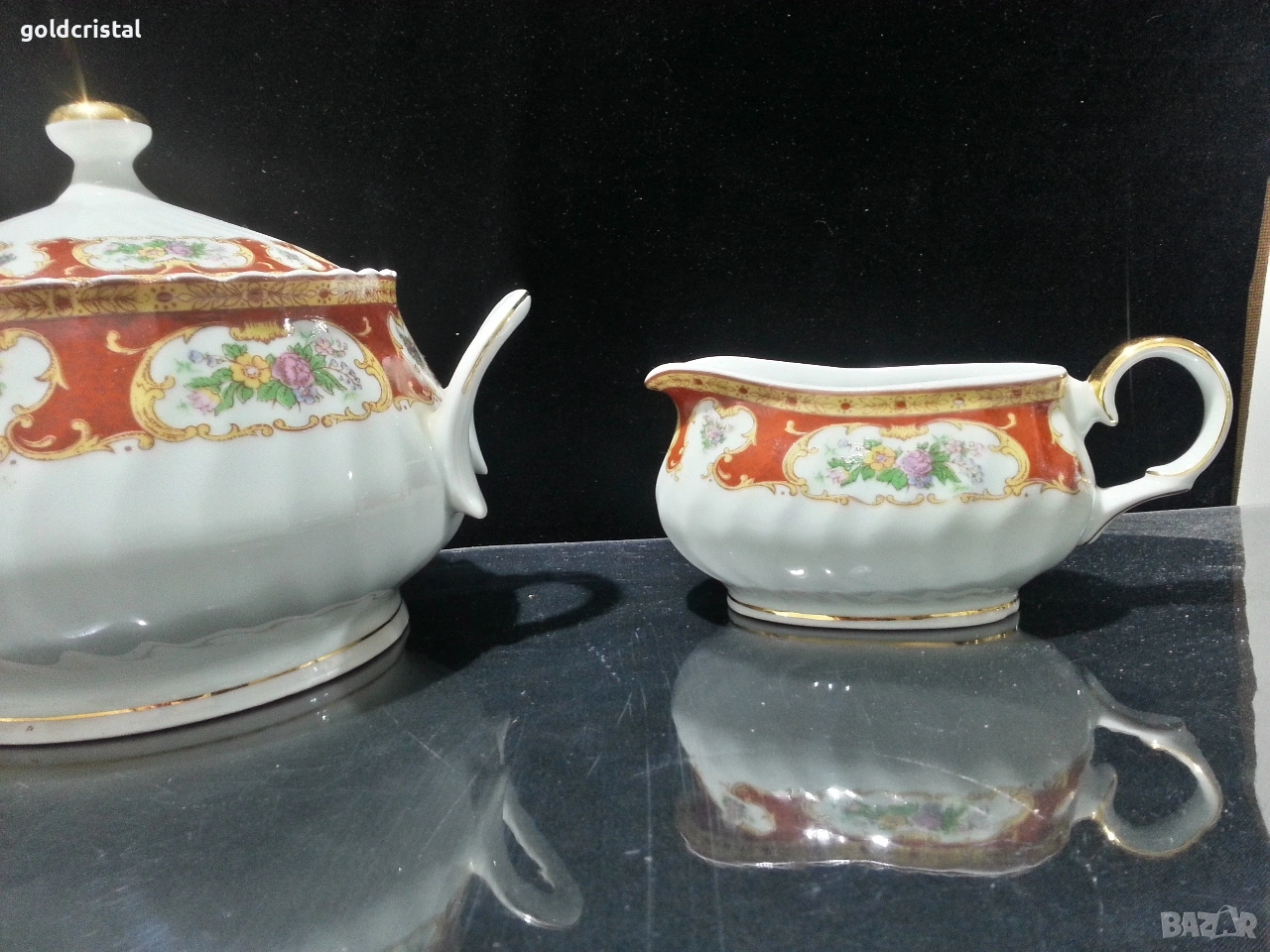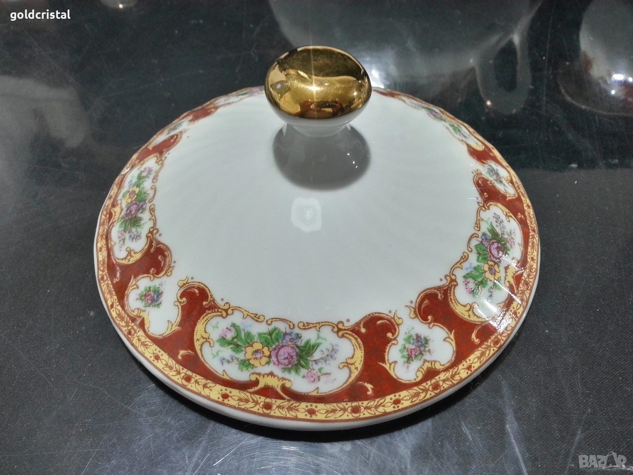 Стар български порцелан китка червен барок супник малък чип отвътре на борда 70€ сосиера 35€ солничка 2 бр-50€ сервиз комплект сет лот ретро арт декор винтидж колекция стари старинни антикварни предмети обзавеждане за дома и семейството подходящи за подарък за ценители и колекционери
