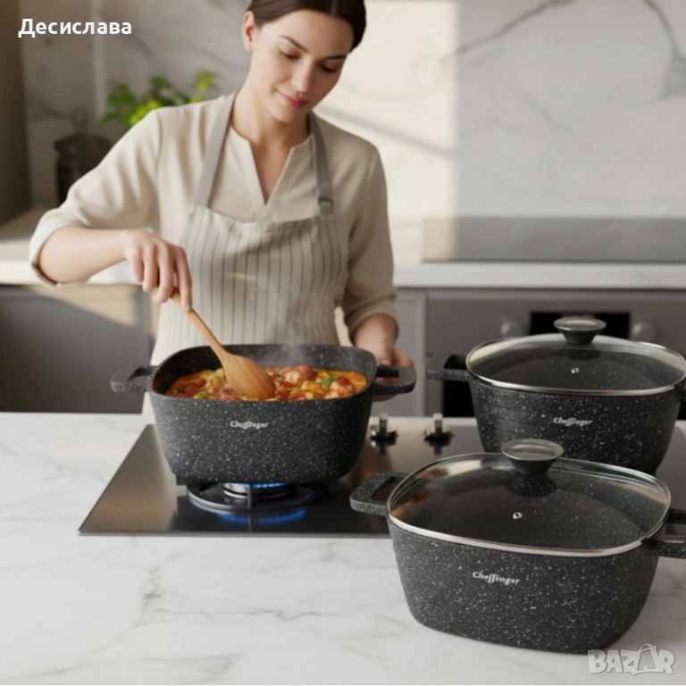 Комплект тенджери – Cheffinger от 3 части с мраморно покритие и капаци + подарък 2 ръкавици, снимка 1 - Съдове за готвене - 53136207 Комплект тенджери – Cheffinger от 3 части с мраморно покритие и капаци + подарък 2 ръкавици, снимка 2 - Съдове за готвене - 53136207 Комплект тенджери – Cheffinger от 3 части с мраморно покритие и капаци + подарък 2 ръкавици, снимка 3 - Съдове за готвене - 53136207 Комплект тенджери – Cheffinger от 3 части с мраморно покритие и капаци + подарък 2 ръкавици, снимка 4 - Съдове за готвене - 53136207 Комплект тенджери – Cheffinger от 3 части с мраморно покритие и капаци + подарък 2 ръкавици, снимка 5 - Съдове за готвене - 53136207 Комплект тенджери – Cheffinger от 3 части с мраморно покритие и капаци + подарък 2 ръкавици, снимка 6 - Съдове за готвене - 53136207 Комплект тенджери – Cheffinger от 3 части с мраморно покритие и капаци + подарък 2 ръкавици, снимка 7 - Съдове за готвене - 53136207 Комплект тенджери – Cheffinger от 3 части с мраморно покритие и капаци + подарък 2 ръкавици, снимка 8 - Съдове за готвене - 53136207 1/8
