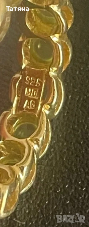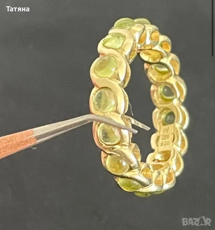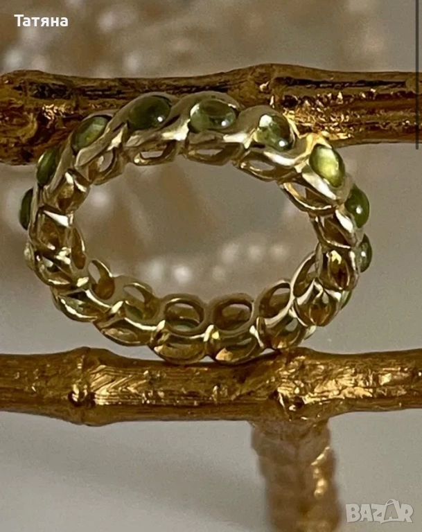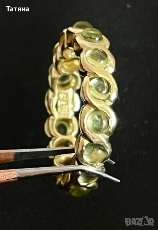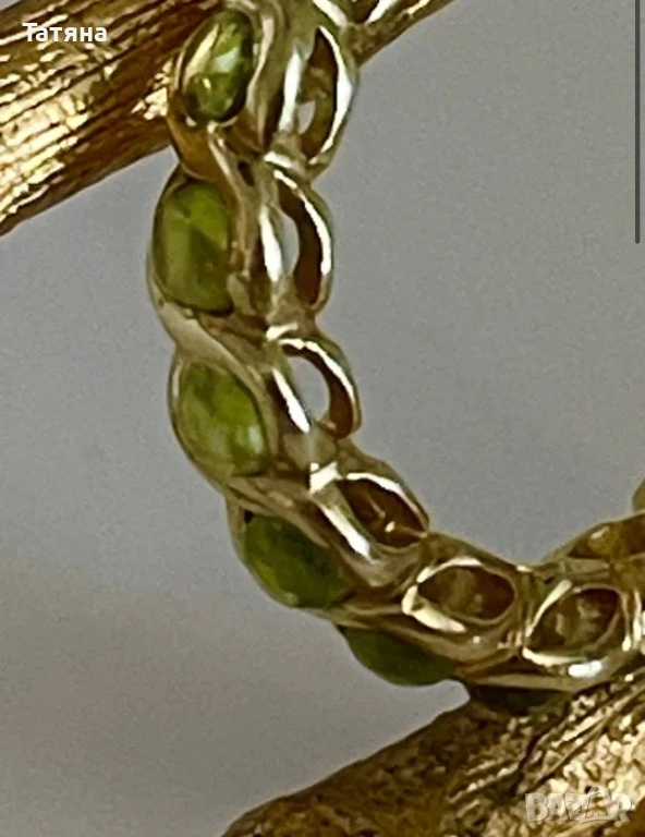 Много красив позлатен сребърен пръстен с вложки от оливин/перидот. Камък има цвят на зехтин или старо зелено стъкло, поради наличието на елемента желязо. Има характерен "мазен" цвят.