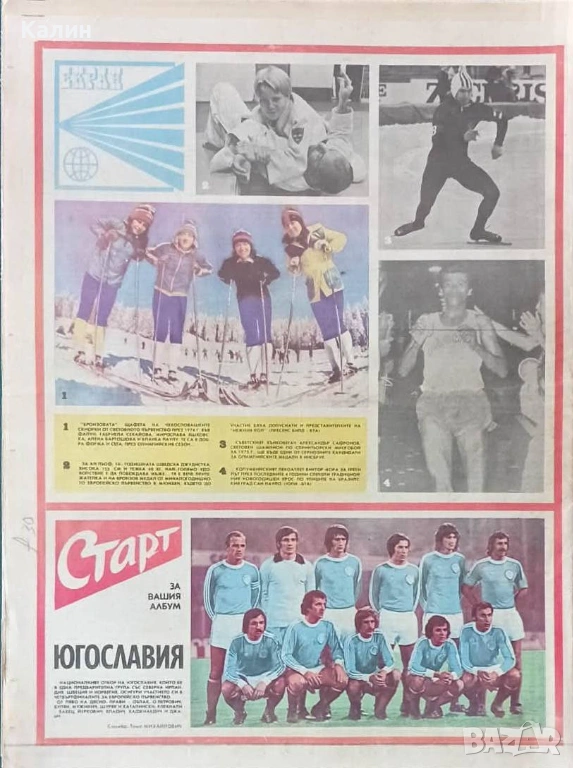 Продавам брой 242 от 20 януари 1976 година на вестник „Старт” на цена 10.50 евро, със снимка на първата страница на Надя Шатърова-състезателка по спортна гимнастика и снимка на последната страница на националният отбор по футбол на Югославия-четвъртфиналист на Европейското първенство по футбол през 1976 година. Изпращам по Еконт или Спиди за сметка на получателя с 10% отстъпка от куриерската услуга, с опция „Преглед". За София е възможно лично предаване в центъра. Има вариант за плащане и по Revolut.