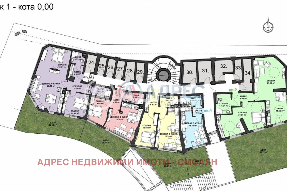 Сред наличните жилища се предлага студио/ателие 4, разположено на първи етаж, с изложение юг и с една от най-добрите гледки в сградата и града. Студиото е с дневна с кухненски бокс, баня с тоалетна, както и напълно самостоятелно дворно място от 12.70 кв.м. Общата площ на жилището е 31.44 кв.м. с общи части, а чистата жилищна площ е 27.44 кв.м. Към имота има прилежащо мазе. Жилището е подходящо както за лично ползване, така и за инвестиция с предпочитаното изложение и отличната локация.