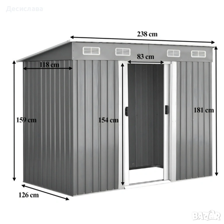 Метална градинска къща за инструменти с вентилация и заключване – надежден навес за подредено съхранение на оборудване, машини и градински принадлежности. Изработена от поцинкована стомана и ламарина в сив цвят, с двойни врати и 4 вентилационни решетки за добра циркулация на въздуха. Предлага се в два размера: малък модел 238 × 126 × 181 см с врата 154 × 83 см и голям модел 277 × 299 × 192 см с врата 165 × 99 см. Подходящ избор за двор, вила или градина.