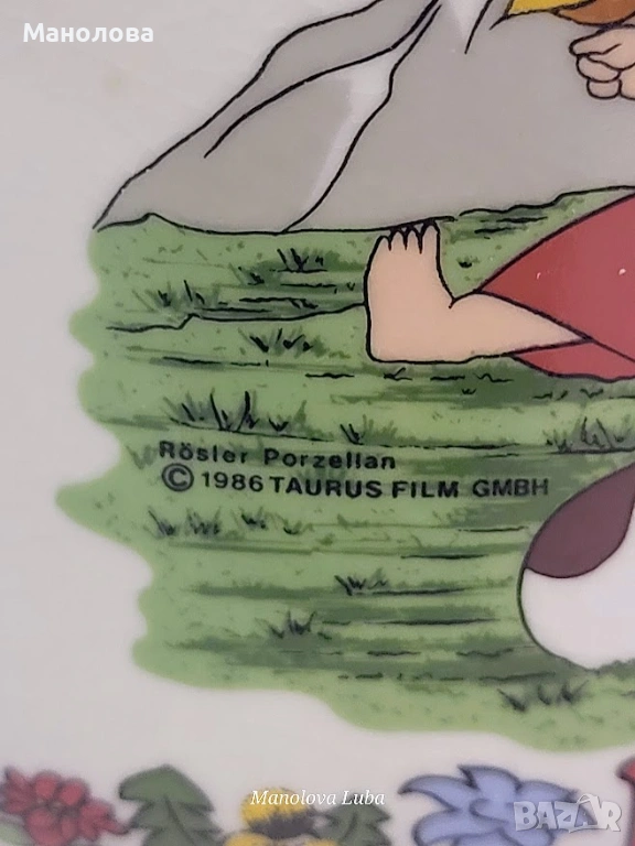Хайди и Петер които седят на поляна със санбернарското куче Йозеф. Щампа Rösler Keramik с отпечатани авторски права. Няма чипове и наранявания, на дъното има леко потъмняване на порцелана.