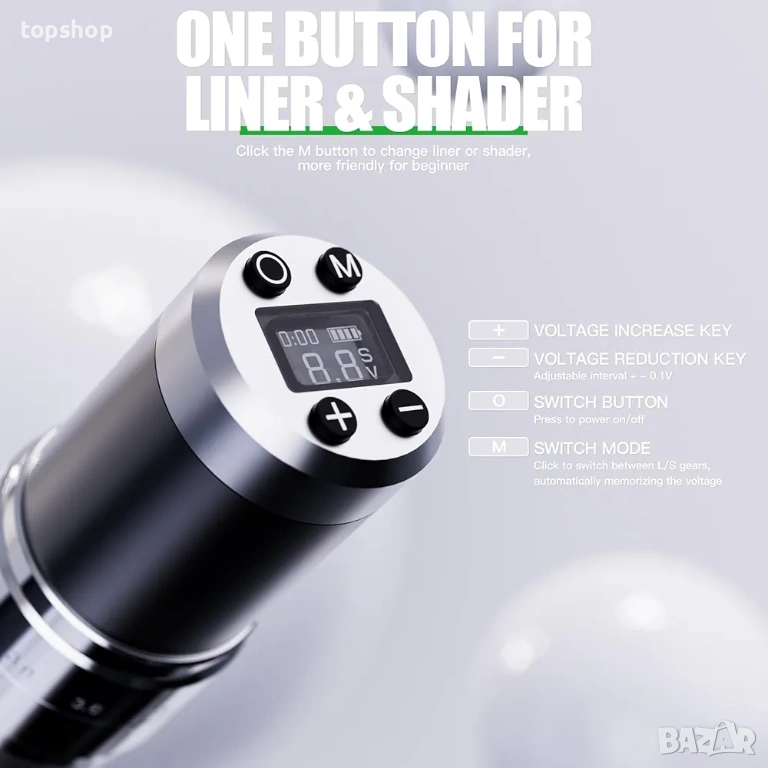 Стабилна задвижваща система за оптимална производителност: С усъвършенствана система за директно задвижване, тази машина за татуировки осигурява плавна, прецизна, мека и тиха работа. Разработена от вътрешни артисти и техници, тази система пренася мастило върху кожата нежно и гладко, което води до висококачествени татуировки. Насладете се на стабилно напрежение и нисък шум, които както вие, така и вашите клиенти ще оцените.