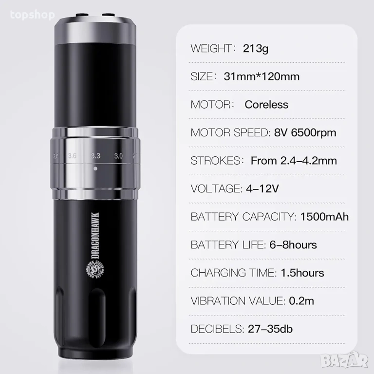 Нова проверена безжична машинка за татуировки Dragonhawk, 2 батерии 1500mAh, 7 дължина на ходовете..