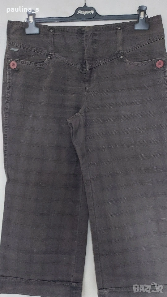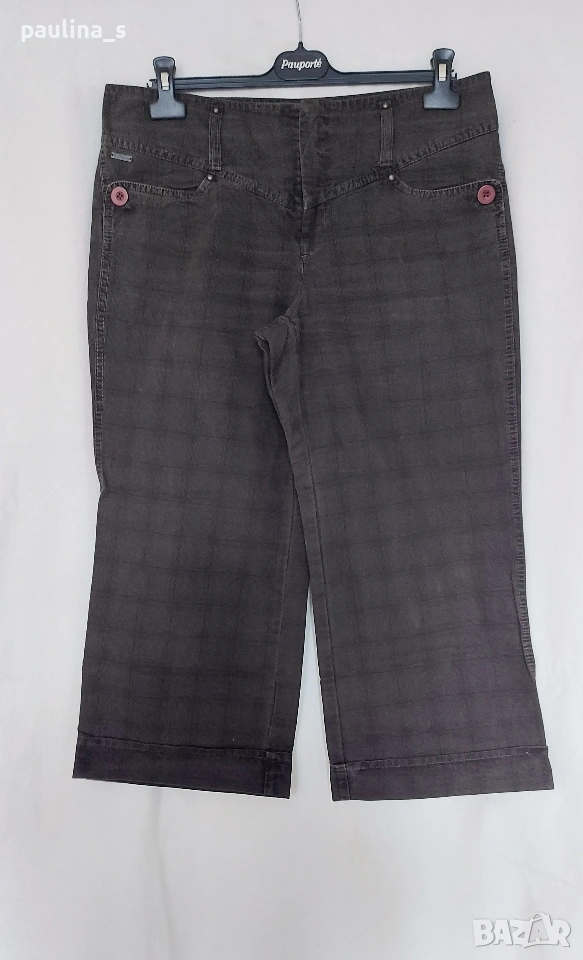 1️⃣. L/ XL - Винтидж! "Steps". Цената е крайна, без пазарлъци 10 евро. Дамски дънкови бермуди от кариран кафяв плат с широки крачоли. Моделът е специален с триъгълна платка отпред, предните джобове са почти хоризонтално разположени отпред и фиксирани с големи копчета в страни. Задните джобове са с филетки(без да е махнат фабричния тегел), не променят шейпът на ханша. Кабсите са само по една на гайките, като гайките са широки и може да ползва колан за ханш. Брандирани копче, метално лого, оксидирани кабси, скрито закопчаване. Крачолите са широки, завършващи с маншет. Дрехата е с изразен избелващ ефект на украсителните тегели. Брандът е дизайнерски. Една бройка, без дефекти и етикет, не са чисто нови.