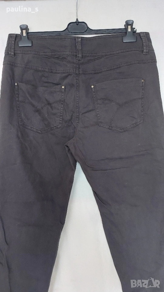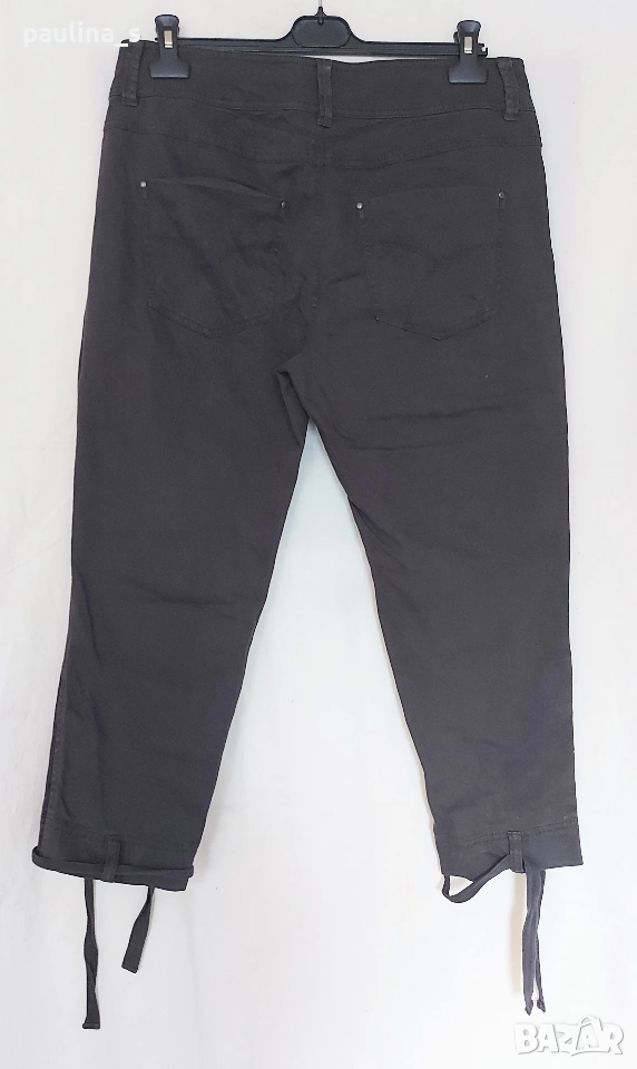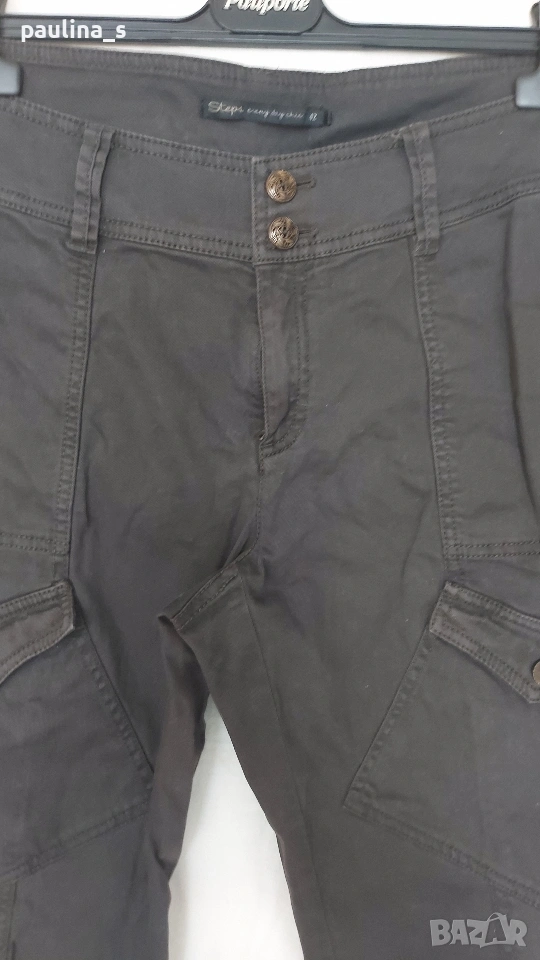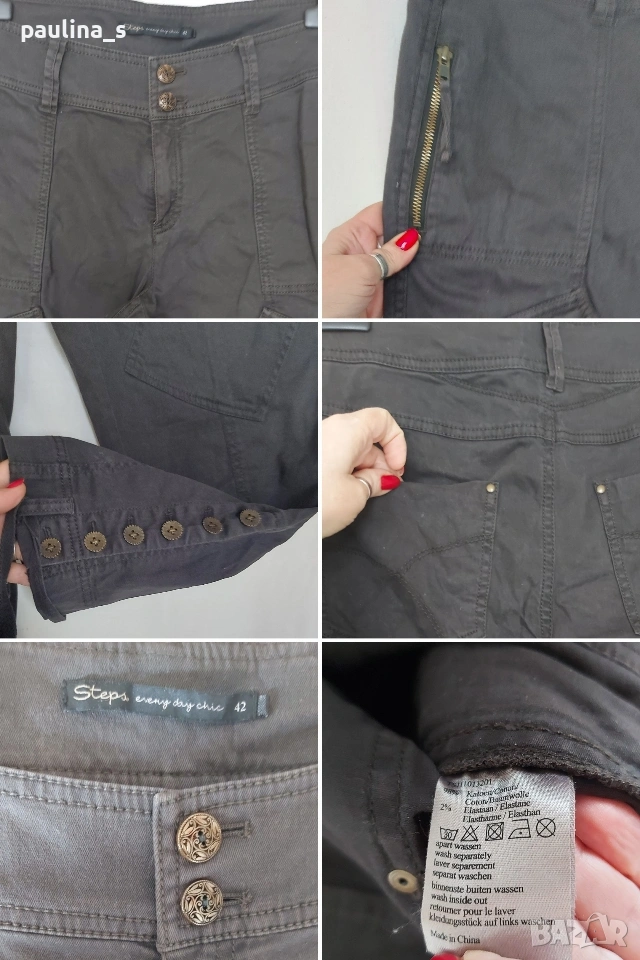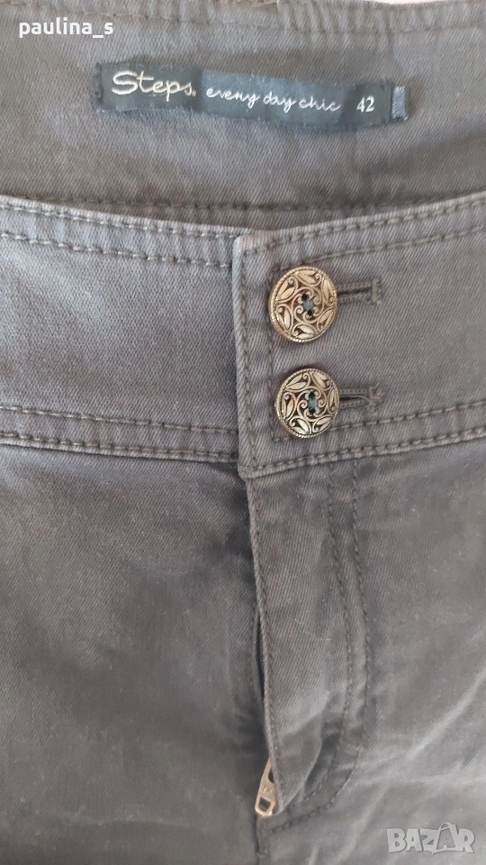 3️⃣. L / 2XL - Vintage! "Steps". Цената е крайна, без пазарлъци 20 евро. Невероятен дънков панталон, модел брич. Цветът е тъмно кафяв Шоколад, платът е еластичен, покрива няколко размера. Моделът е неописуем с широка талийна платка, предните горни джобове са с ципове и не променят шейпът на ханша. Отпред върху бедрото са разположени косо украсителни джобове с капаци и копчета - карго брич. Металните орнаменти-копчета, ципове и кабси са с оксидация. Надолу крачолите се стесняват, като завършват с цепки и с по 6 броя ефектни копчета, като има и допълнителна лента за стесняване и оформяне на модела - "Брич". Дрехата е екстравагантна, и неповторима, без дефекти и етикет, като нова.