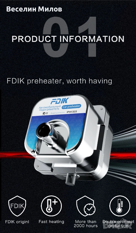 течност се затопля със електрически награвател и се предвижва с вградена в подгревателя помпа.Наличието на вградената помпа спомага за бързото и равномерно подгряване на двигателя. Корпуса на подгревателя е изработен от алуминий, което го прави лек и корозоустойчив.Вградения безчетков мотор на помпата спомага за нейния по-дълъг живот.Използваната технология на разделно нагряване , нагревателния елемент на контактува с охладителната течност, а нагрява специална оребрена пластина, която от своя страна нагрява охлаждащата течност.Това решение води до по-ефективна работа на подгревателя, както и до увеличаване на неговия живот. Във вътрешната част на корпуса се намира датчик за температурата с помощта на който подгревателя се изключва при достигане на зададената температура - 70гр.С; и отново се включва при достигане на 60гр.С;.При недостатъчна охладителна течност в подгревателя следва автоматично изключване на захранването за 30сек.