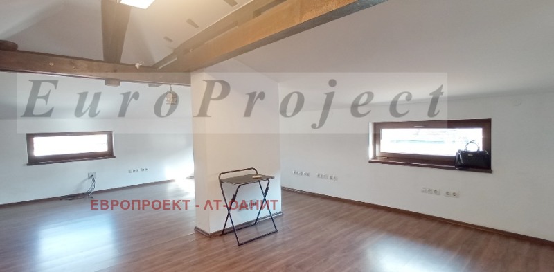 - Офисът е след ремонт и се състои от еднопространствено светло и просторно помещение. Разчупената му форма предоставя възможност за обособяване на отделни кътове в зависимост от предпочитанията на новия наемател. Помещението е артистично оформено, рзполагащо с няколко прозореца за дневна светлина, а скосяванията в най-ниската му част са със светла височина 165 см. На етажа е разположен санитарен възел /wc с мивка/ - общ за етажната площадка.