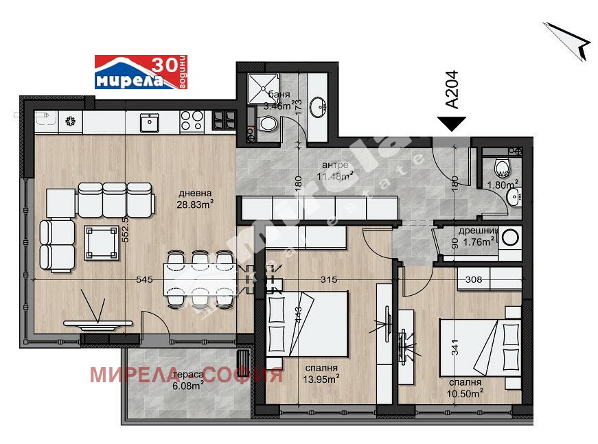 Апартаментът е със следното разпределение: коридор, дневна с кухненски бокс и трапезария, две спални, баня с тоалетна, тоалетна, склад и две тераси.