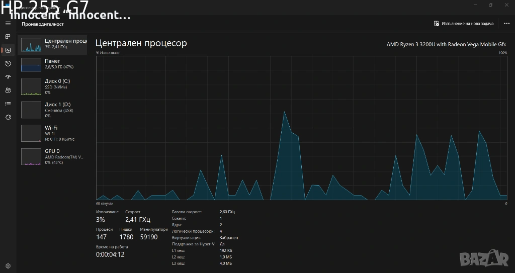 Процесор: AMD Ryzen 3 3200U – 2.60 GHz