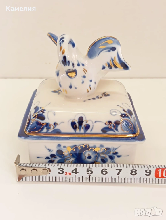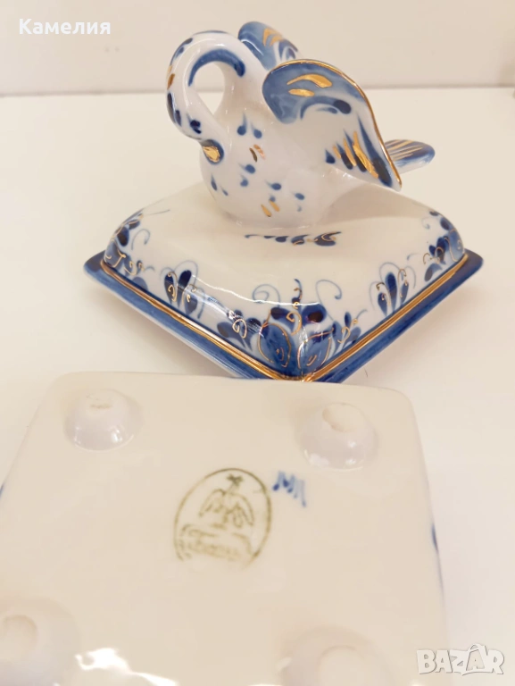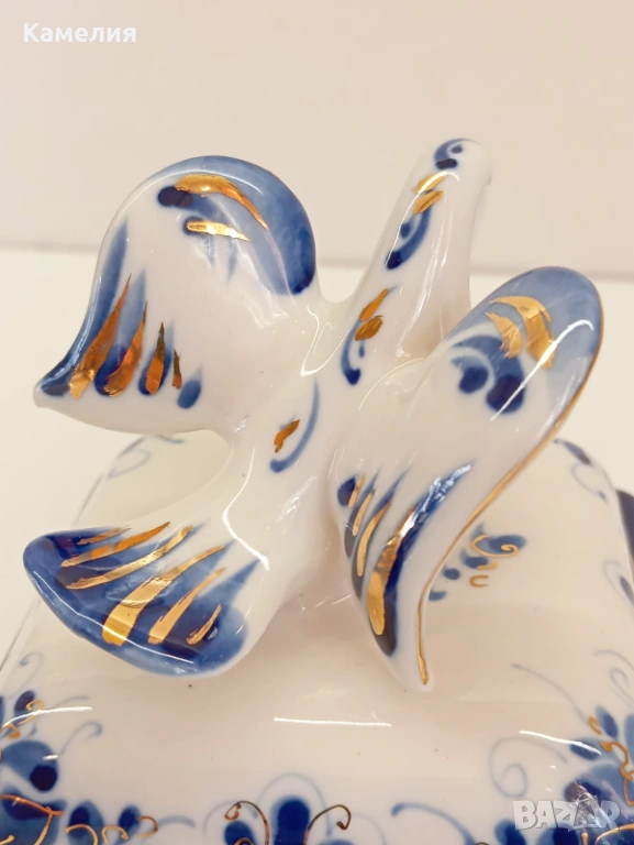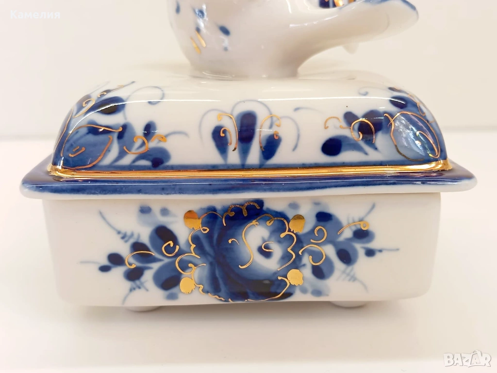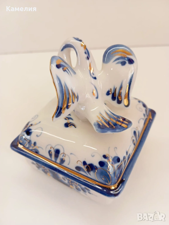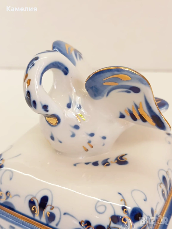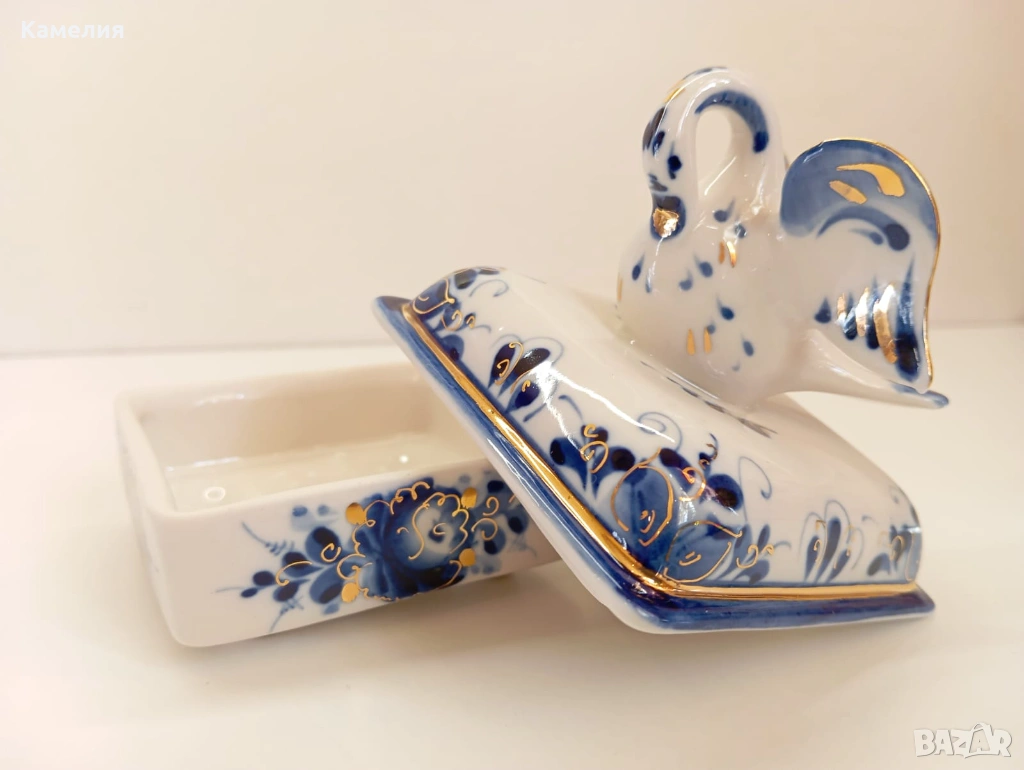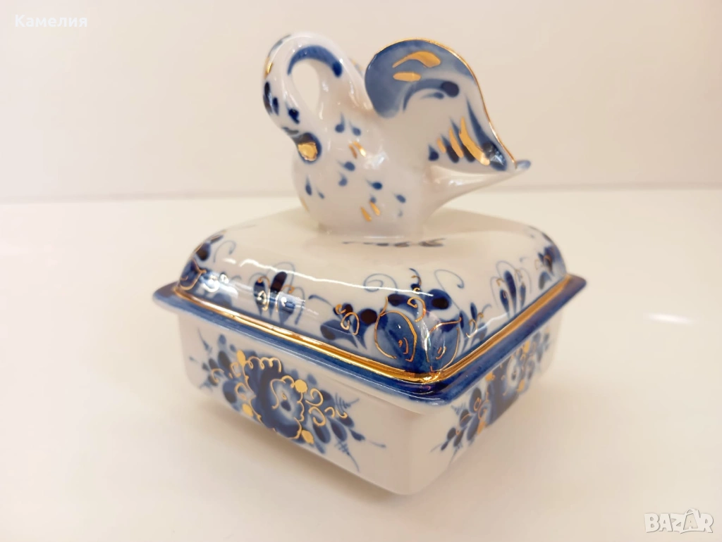 Руска Гжел. Кутия за бижута Лебед. Авторска. Ръчно рисувано. Злато. Нова е.