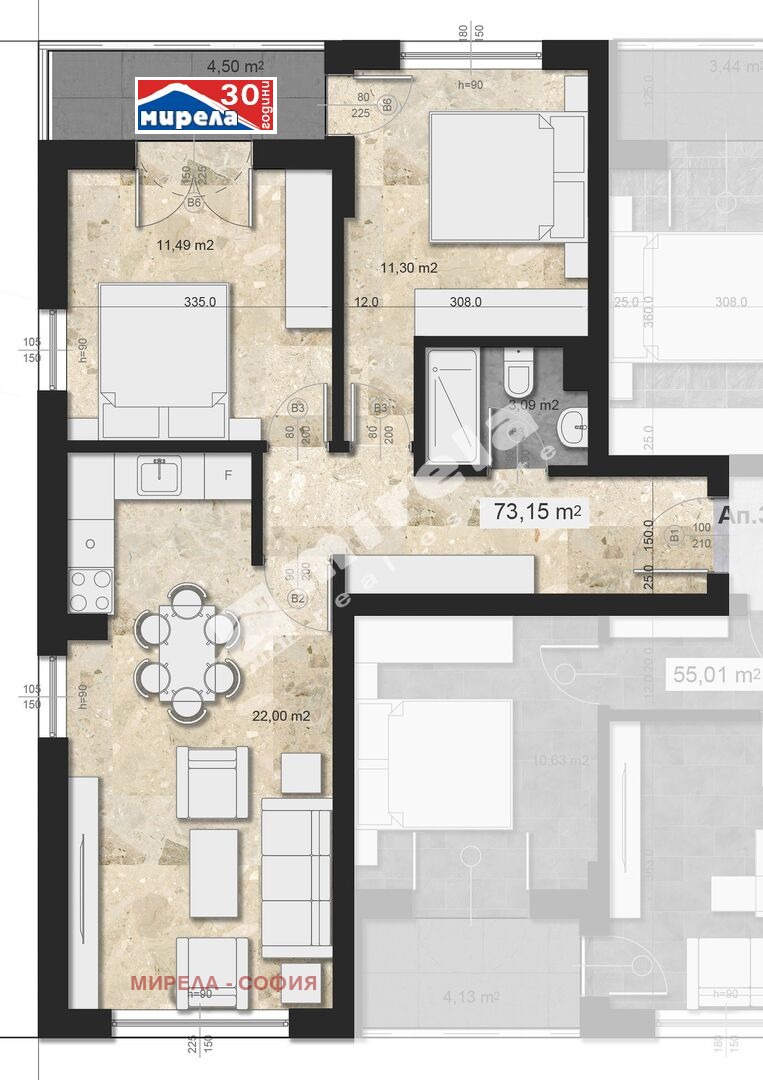 Разпределението на предлагания имот е следното: антре, дневна с кухненски бокс и трапезария, две спални, баня с тоалетна и тераса.