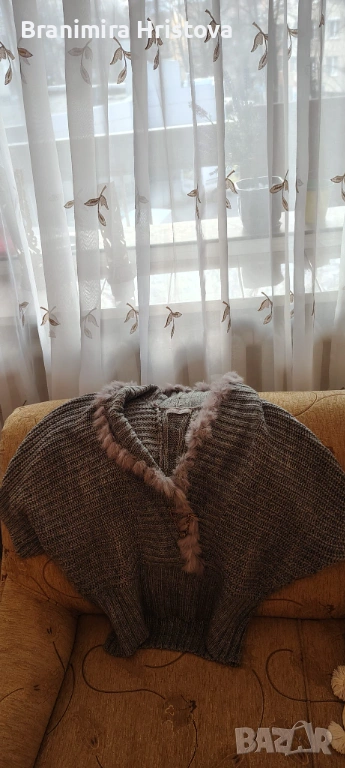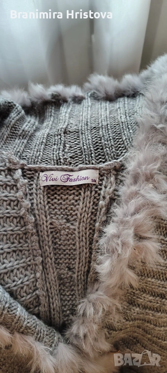 Vivi Fashion – сив пуловер/жилетка с пухкав кант (еко косъм) по деколтето; размер S/M.