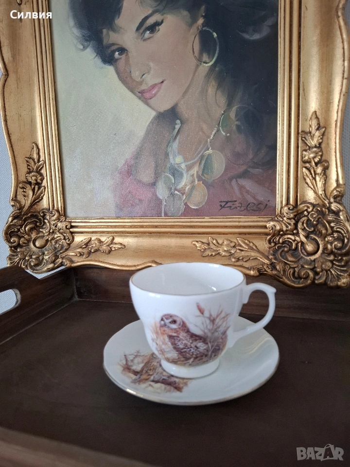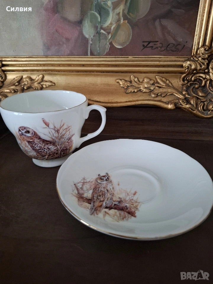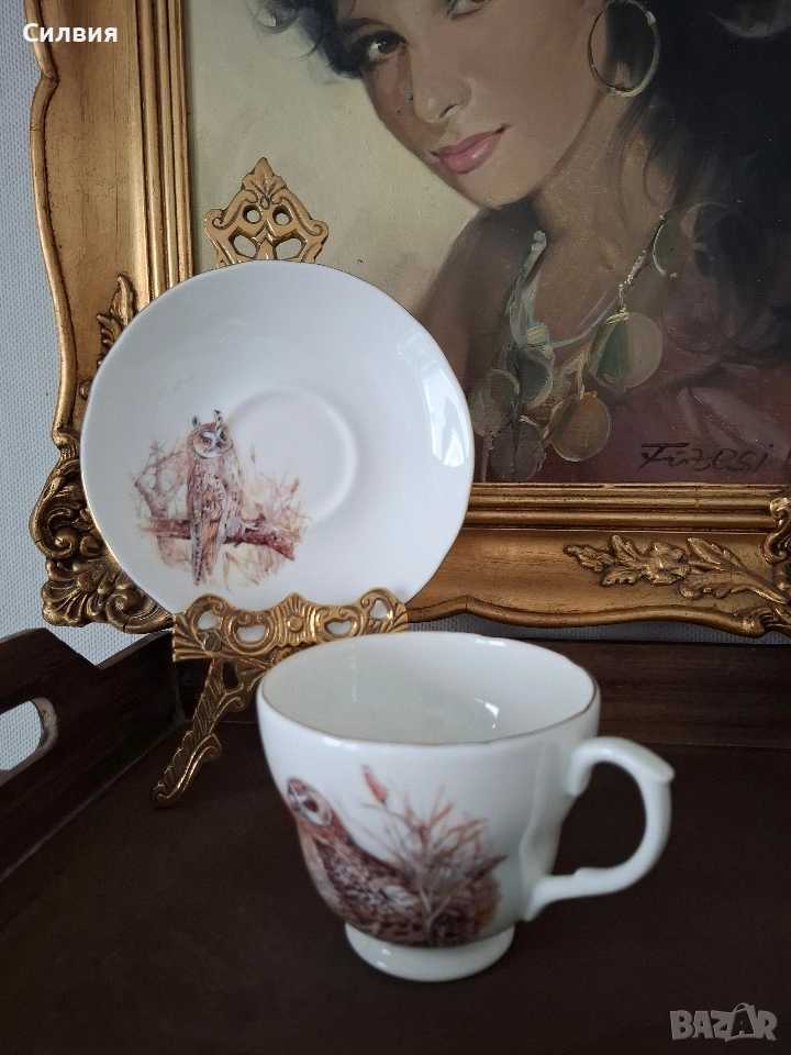 Винтидж английски комплект – чаша с чинийка от фин костен порцелан (300 мл) Очарователна класическа английска елегантност в този изискан винтидж комплект. Изработен от висококачествен костен порцелан, той впечатлява с изключителна лекота, финес и прозрачно бяла глазура. Голяма вместимост от 300мл. Декориран с нежни художествени илюстрации на горски птици – топли, детайлни и изпълнени с характер. Златистият кант допълва ретро стилистиката и придава усещане за истински колекционерски предмет. Подходящ като елегантен акцент в интериор или колекция от ретро сервизи. Състояние: отлично, и запазил цялото си винтидж очарование. Цена 2️⃣8️⃣€ 《54,76лв》 •✽✧✽•°”˜🦉”°•✽✧✽•°”˜🦉”°•✽✧✽•°”˜🦉”°•✽✧✽•°”🦉˜”°•✽✧✽•