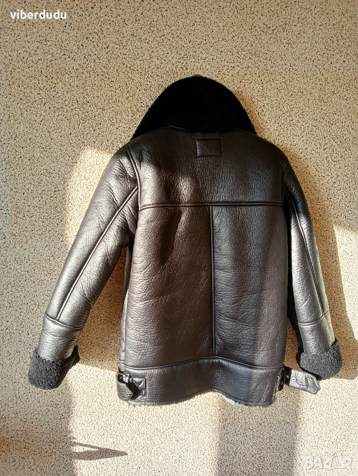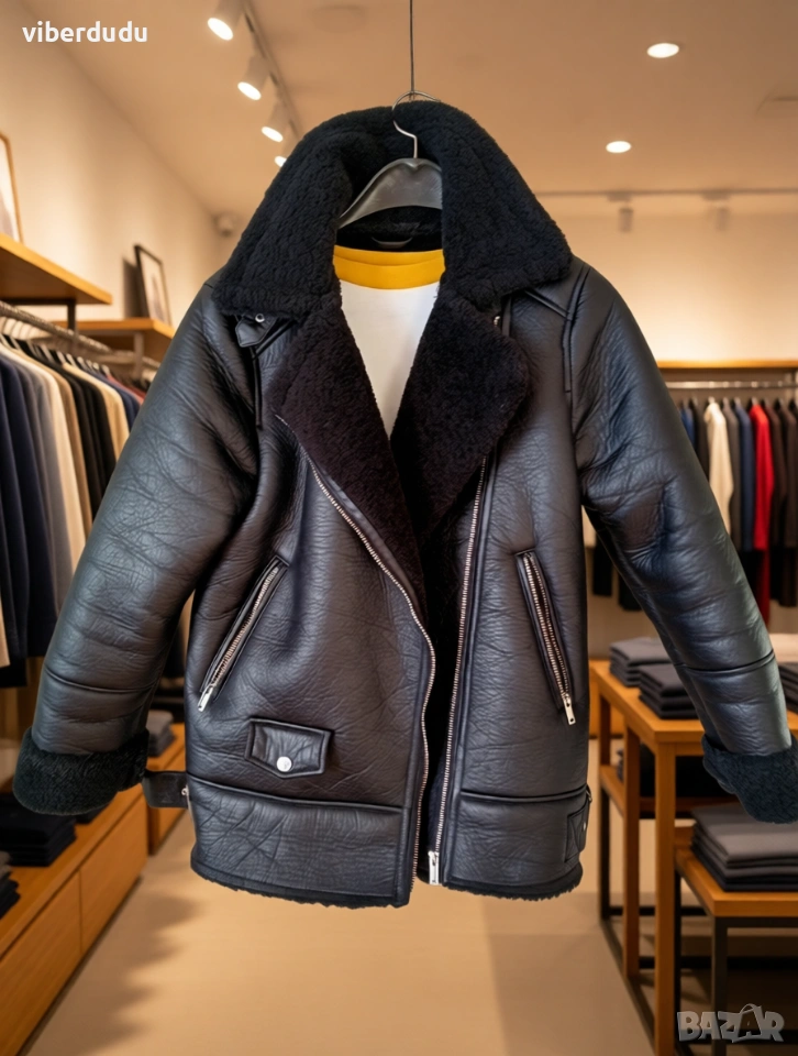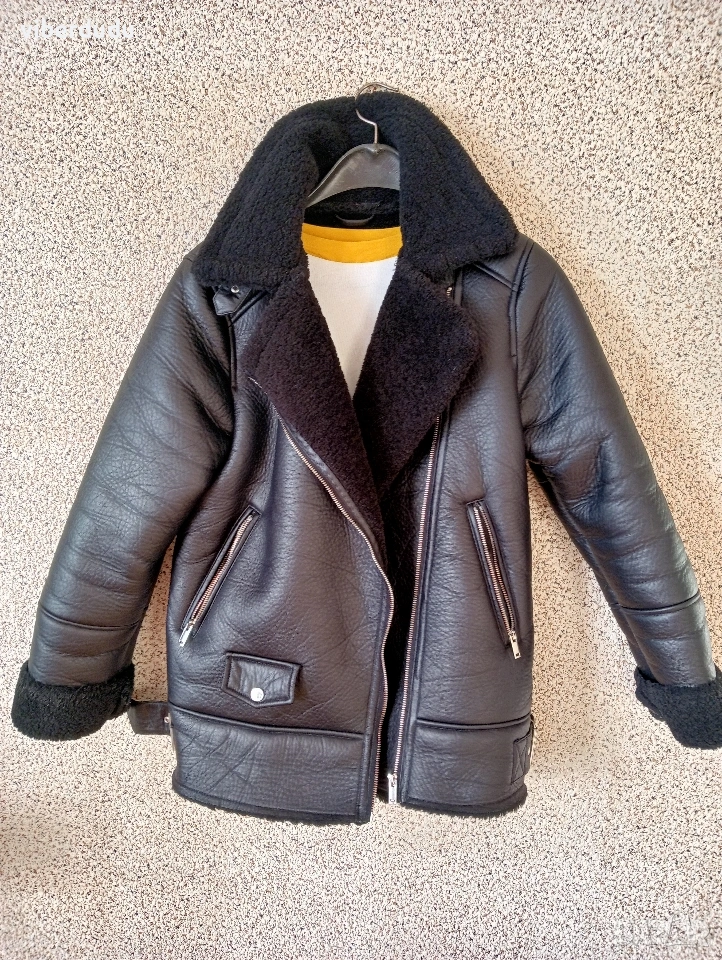 Елегантно черно палто тип "авиатор" Zara / House (Унисекс) Продавамe стилно, топло палто тип "авиатор" (от изкуствена кожа с подплата от изкуственa овча кожа) от известната марка Zara/House. Този модел, вдъхновен от класическия летателен стил, съчетава здравина и комфорт. Основни характеристики: Цвят: Класически черен. Материал: Висококачествена изкуствена кожа отвън и мек, уютен изкуствен косъм (овча кожа/шерпа) отвътре и на яката. Фасон: Правa кройка, стил "авиатор" или "пилот", с широки ревери и асиметричен цип. Размер: Посочен като S-М (EU SIZE S), подходящ както за жени, така и за мъже (унисекс). Детайли: Има функционални джобове с ципове, както и декоративни елементи като каишки с катарами на яката и в долната част на артикула. Състояние: Отлично, без дефекти, като ново. Топлина: Много топло, идеално за студено, ветровито и дори дъждовно време.