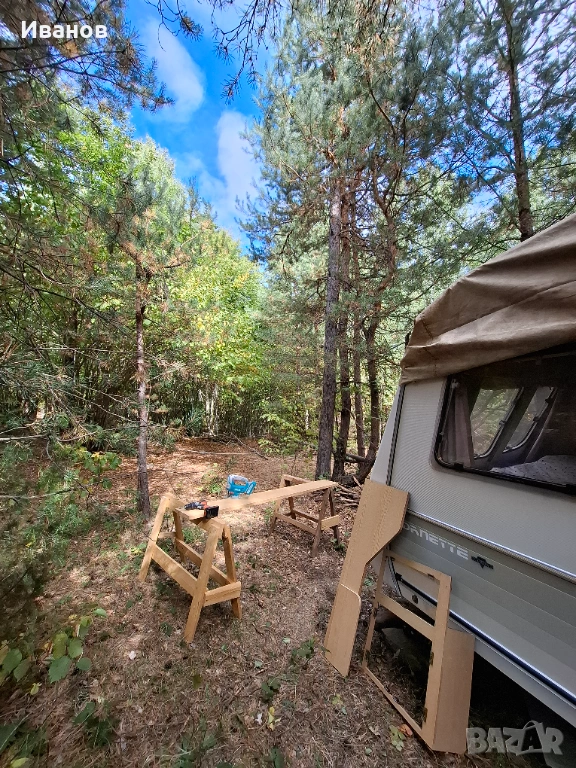 Продавам тихо и уединено място с борова горичка, извор и каравана с навес. Стига се по черен път.