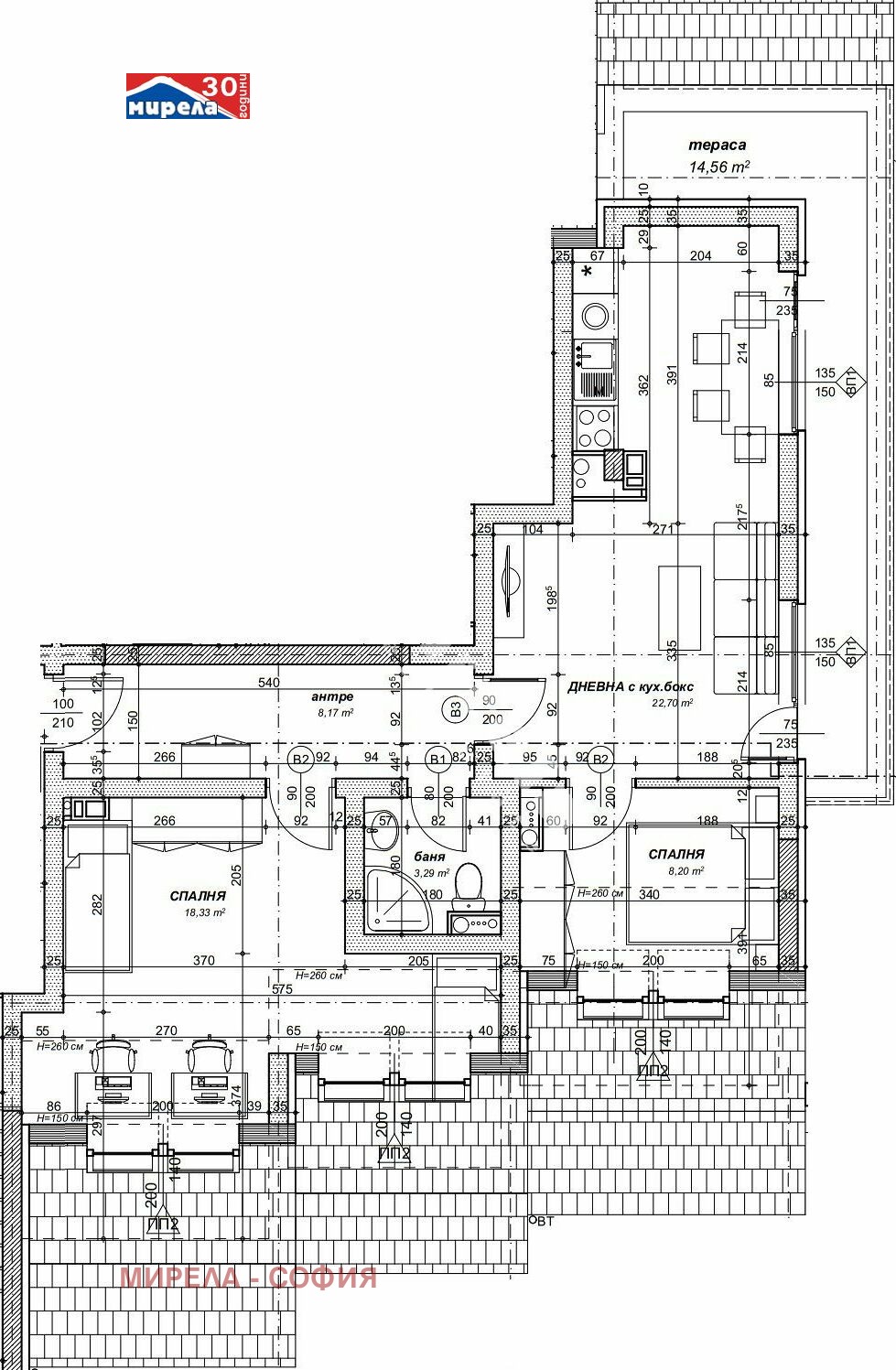 Апартаментът е със следното разпределение: антре, дневна с кухненски бокс и трапезария, две спални, баня с тоалетна и тераса.