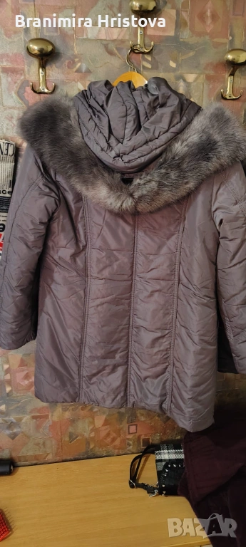 Продавам дамско зимно яке тип пухенка в елегантен сиво-лилав/графитен цвят. Топло и удобно за студено време. Моделът е с качулка и пух/косъм по ръба, както и красиво вталяване с декоративни шевове и детайли.