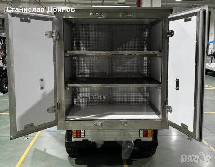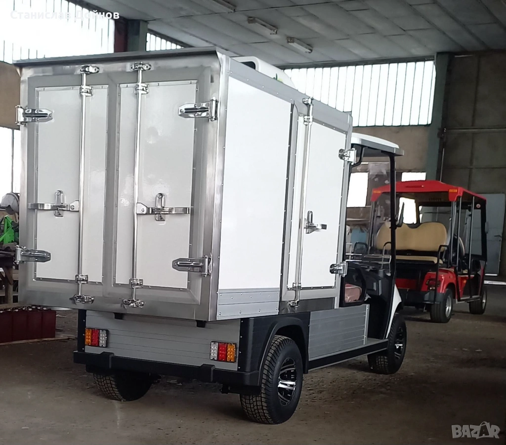 Специализирана голфколичка с агрегат за охлаждане или подгряване на кутията за контролирана достaвка на храна. Многофункционална термо кутия от антибакктериален материал със раздвижени стилажи, две странични и две задни врати за лесен достъп. Количката е с необслужваем безчетков АС мотор, нов модел зарядно устройство монтирано на шасито, необслужваема батерия, LED светлини. Качествено направена, надеждна машина, която се произвежда по поръчка. Гаранция 2+2 години. Възможна доставка до всяка точка в страната и северна Гърция. Продажба с фактура като посочената в обявата цена е без ДДС.