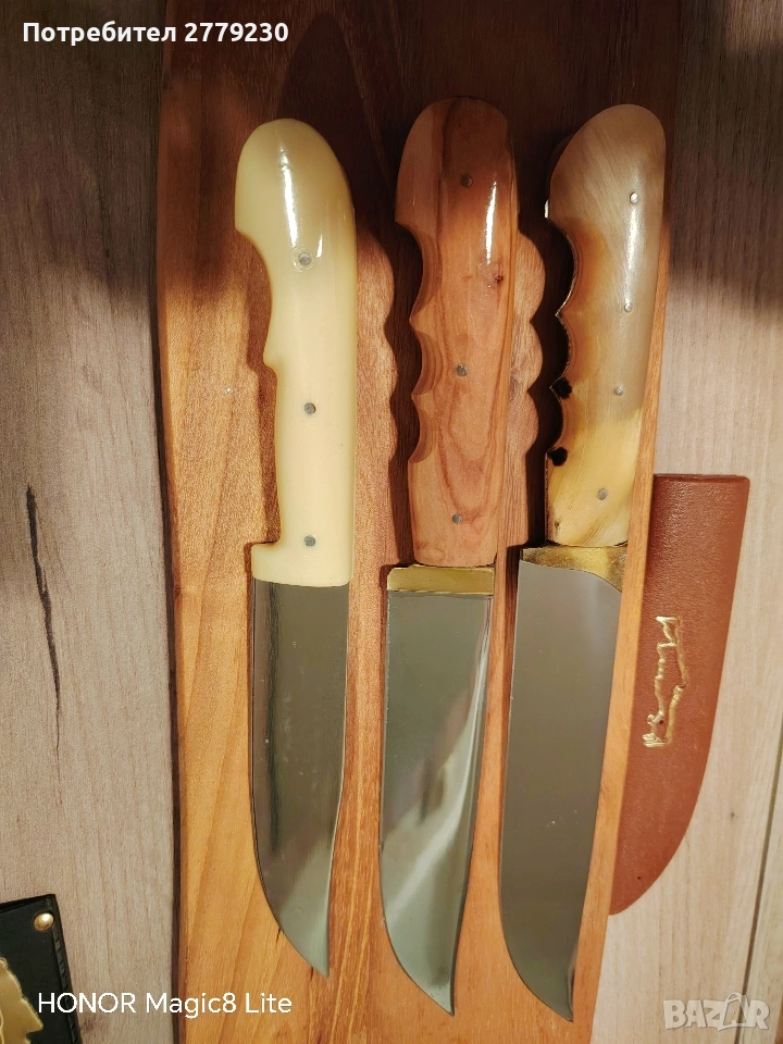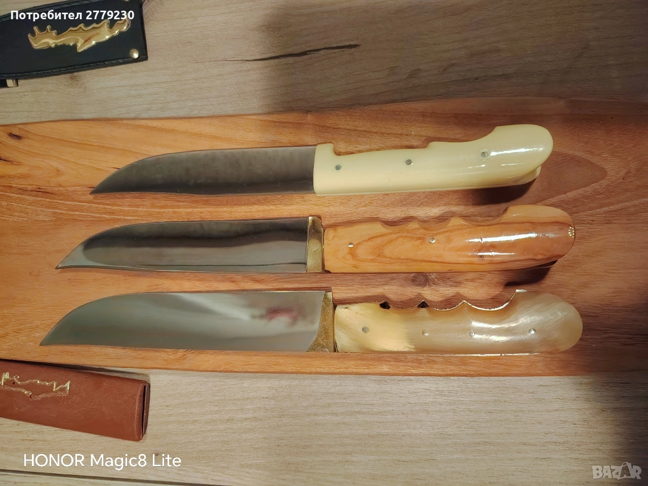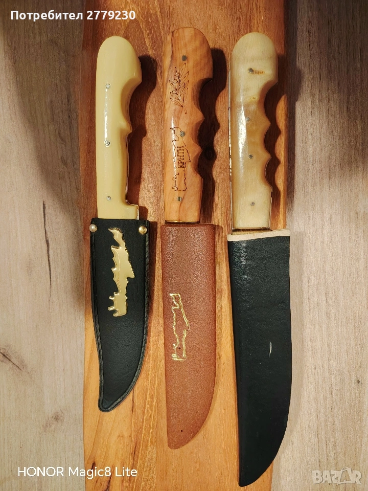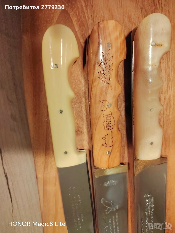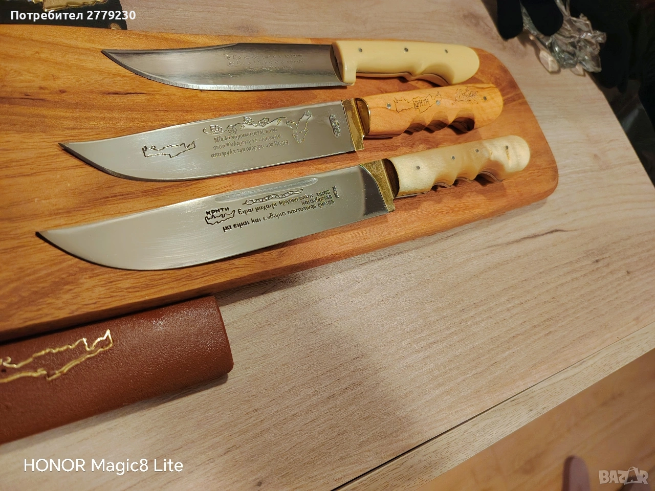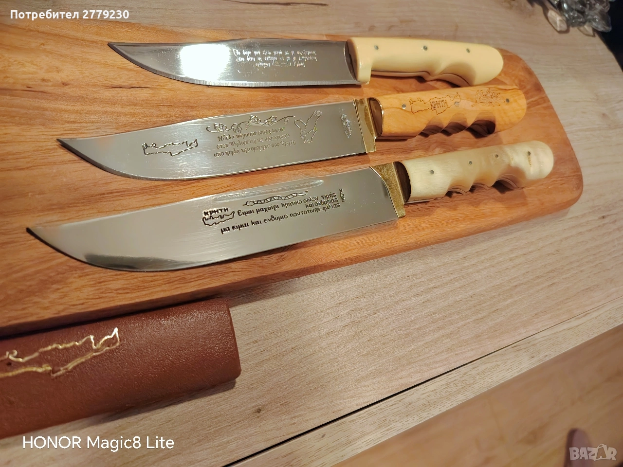Качествени ножове изработени на остров Крит . Всичкте са нови с индивидуално послание на всеки изографисано на острието. С дръжки от дърво и рог. С обща дължина 27.5см., 26 см. и с 23 см. Съобщение или обаждане за уточнявне на цените. С преглед преди заплащане.