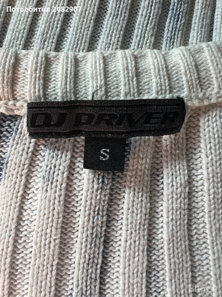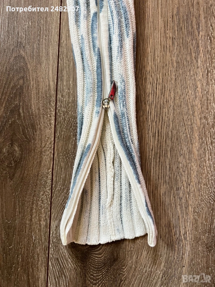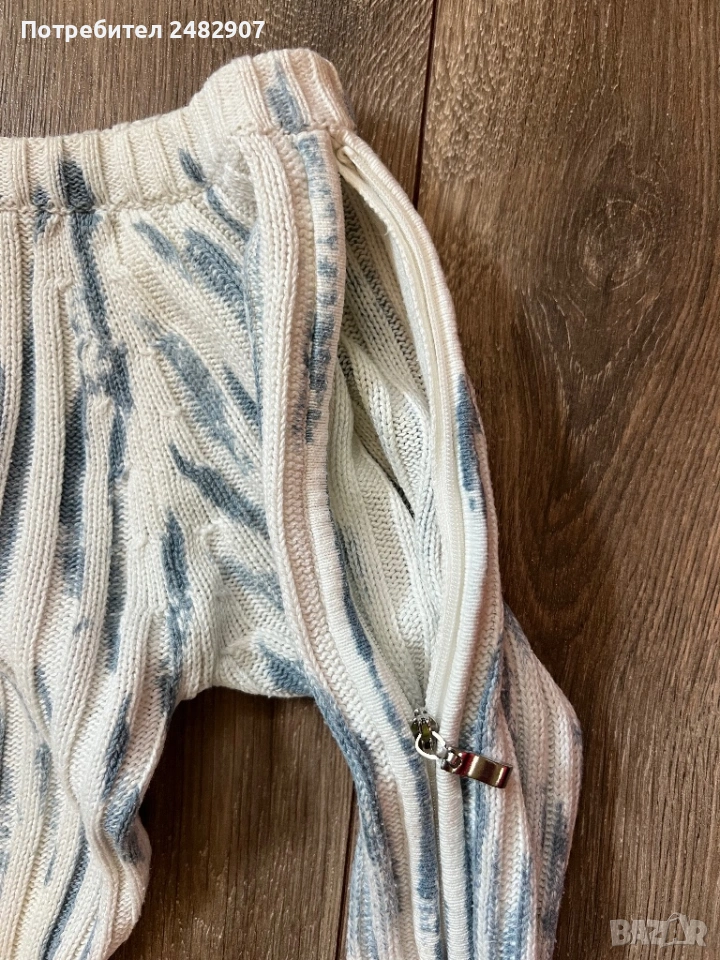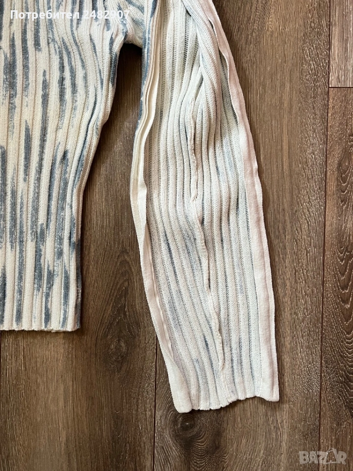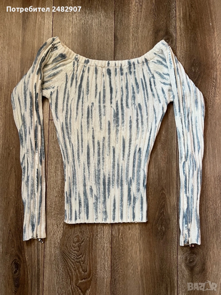 Машинно плетена дамска блуза в бяло и светло синьо, размер S. Ширина в раменете - 41 см, ширина под мишниците -38 см, ширина в долната част - 27 см, дължина от рамото до долу - 58 см, дължина на ръкава от рамото - 62 см, ширина на ръкава в долната част - 8 см. Много запазена, ефектна, с голи рамене и ципове по дължината на ръкавите.