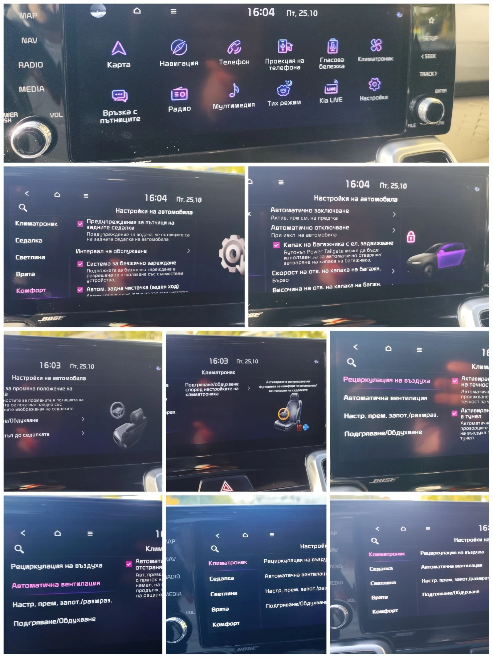 Най-високото ниво на оборудване предлагано за този модел. Колата е напълно обслужена преди 1000км. Сменени са филтри и масло. 4 нови зимни гуми Континентал , закупени за 2000лв. Киата самопаркира дистанционно от клчоветете, чрез бутони. Разполага с 360 камери и адаптивен парктрони със система за приближаващи коли и кръстосан трафик. Прожектира завоите на таблото при пускане на мигачи. Амбиентно осветление с множество цветове и комбинации, ел. кожен салон с перфорация-подгряване, обдухване, памет, надуване на седалките+бутони на пасажерската седалка за по-комфортно пътуване и местене на седалката+вградени в седалките usb изходи. Мултимедията е с озвучаване Bose , Wi-fi, Bluetooth, carplay, android auto, 3d navigation с упътване на дисплея , на дигиталният километраж и на Haed up системата с прожектиране на челното стъкло. На head up display се прожектира също и скорост, мъртвите зони, сигнализира за идващ автомобил, кръстосаният трафик, адаптивният круиз контрол с дистроник радар, мултимедията. За комфорта на 2рият ред седалки се грижи климатроник , подгряване на седалките, щори на прозорците, регулиране на задните седалки във всички посоки и положения, и отлична светлина идваща от панорамният отваряем таван. Багажникът е електрически със система за разпознаване при приближаване на собственика-отваря се сам, без да е нужно да натискате бутони. Също така има и много скрити отделения за багаж. Пасажерската седалка разполага с подгряване и охлаждане, както и ел. движение и позициониране. Колата има също и безжична станция за зареждане на телефон, асистент за мъртви зони, следене на осеви линии и пътна маркировка, разчитане и прожектиране на пътни знаци, система за подържане на пътното платно-сама си кара и завива при активиране на дистроника. Има и ситема за контрол при спускане, система за пускане на камерите при движение, ПОДГРЯВАНЕ НА ВОЛАНА! Напълно автоматични Full led фарове и халогени с автоматично превключване на къси и дълги светлини, при влизане в тунел колата сама затваря прозорците и пуска рециркулация на въздуха. Седалата на шофьорът има функция за посрещане и изпращане, фаровете също са с такава функция. Скоростната кутия е 8 степенна ИСТИНСКА автоматична с хидротрансформатор АИСИН с джойстик-единствено на 2, 2 дизел е такава! На другите Соренто е с двоен съединител или cvt-тоест ненадеждни и чупливи. Има още куп екстри които изпускам. Колата е с 2 ключа, като и от двата ключа колата може да се паркира дистанционно без да сте в нея. Kолите от Кореа и Америка нямат нищо общо като параметри и екстри с тази кола! Също така и с части и консумативи. Тази кола е произведена за Европа с най високото ниво за модела! За въпроси, моля обадете се.