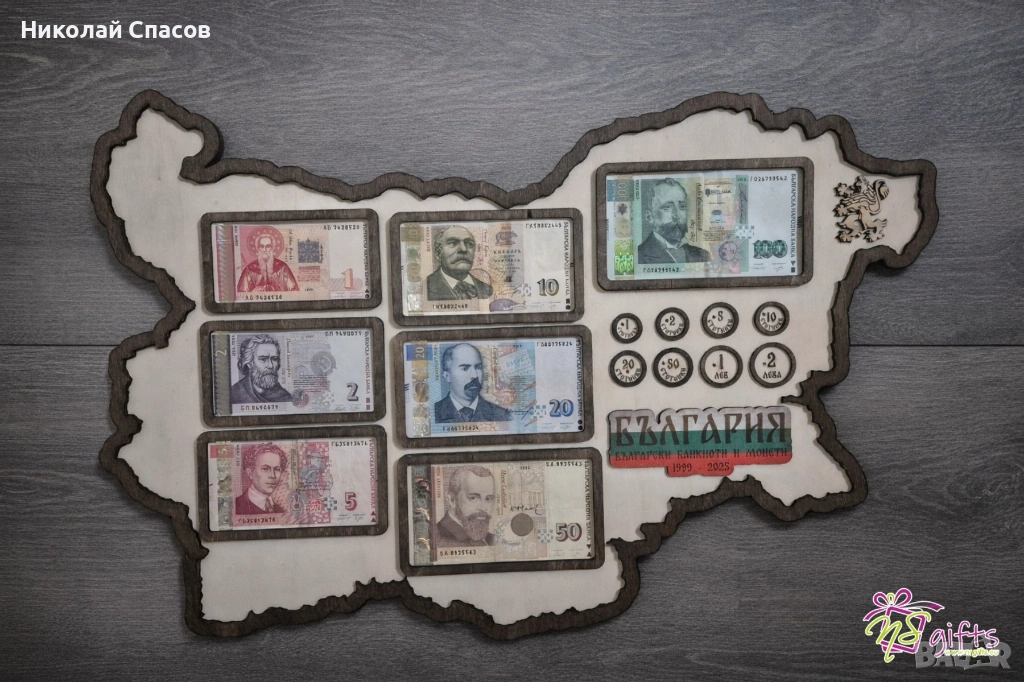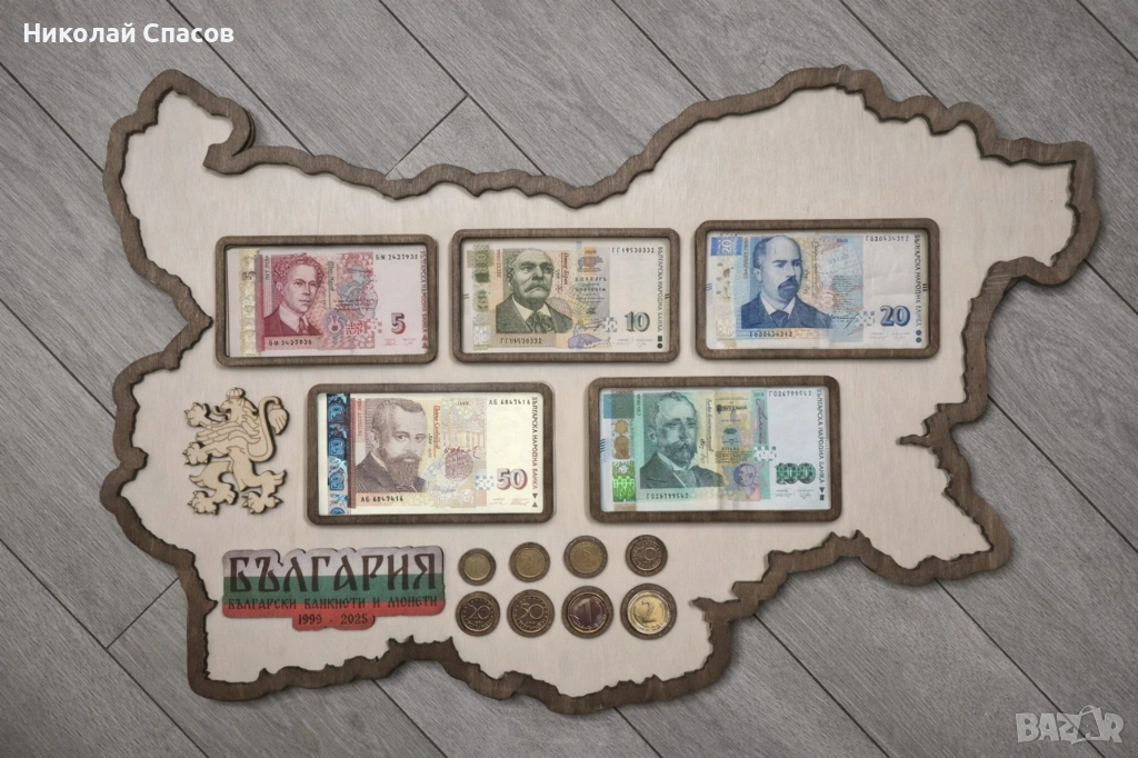 Дървена рамка за колекционери, специално изработена във формата на картата на България, предназначена за подреждане и съхранение на български банкноти и монети от периода 1999–2025 г.