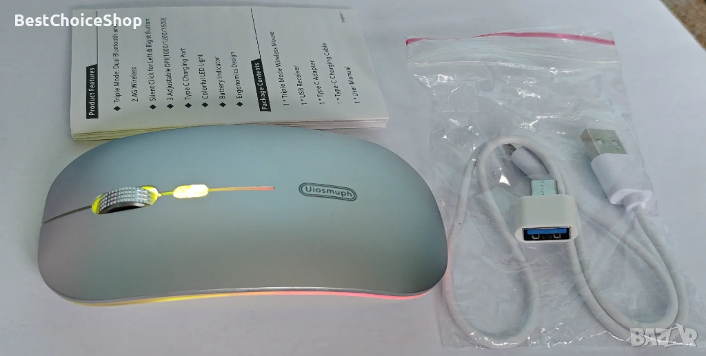 Uiosmuph Bluetooth мишка, ултра тунка, безшумна, RGB