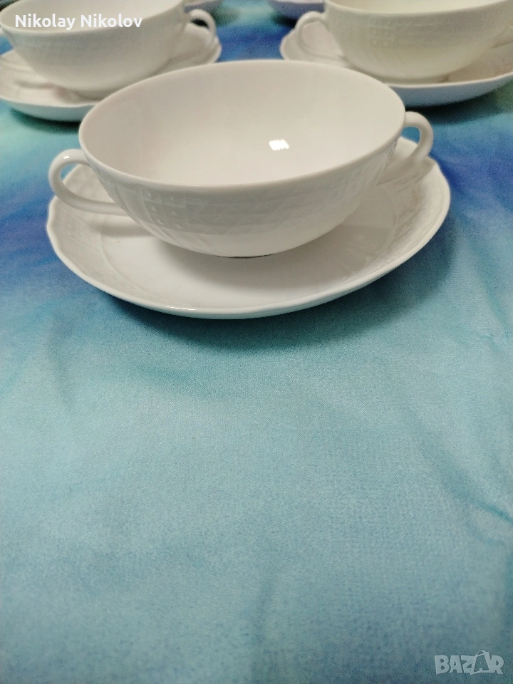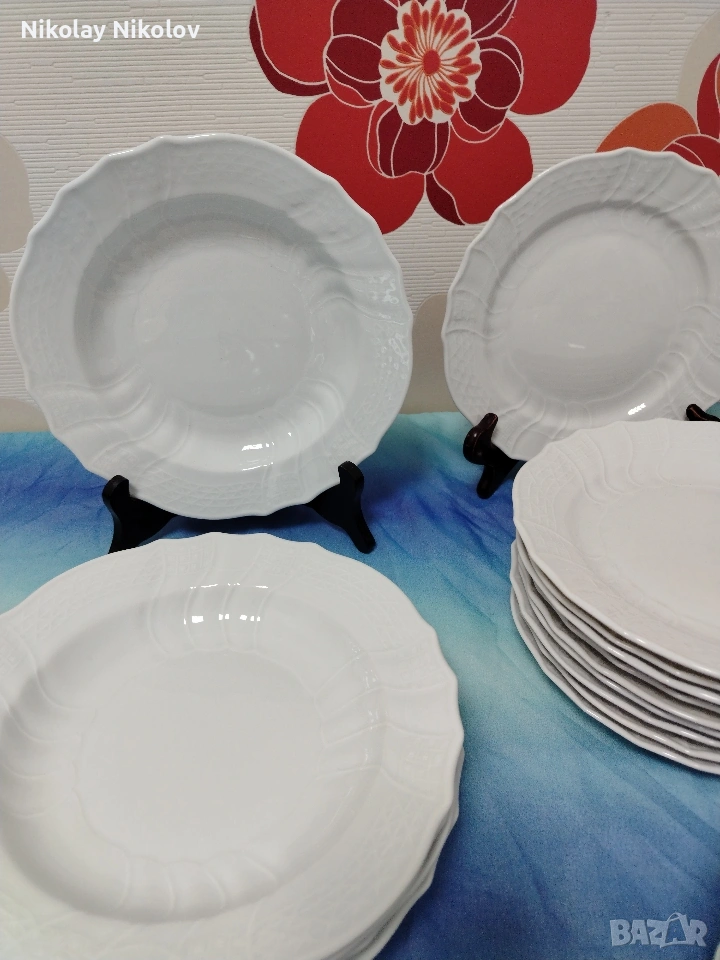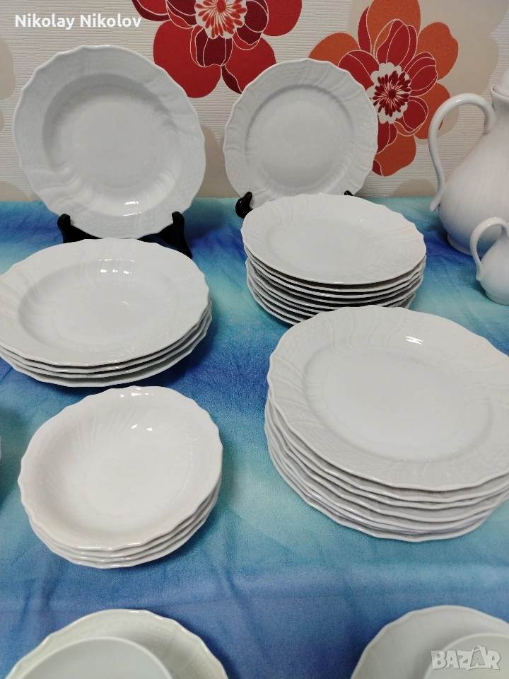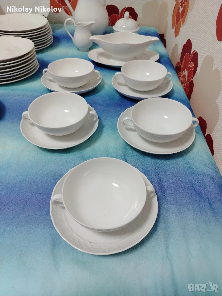 Предполагам прекрасен немски порцеланов сервиз на известна немска марка сервизът е без следи от употреба нов състоящ се от 5-дълбоки чинии 21см 18-плитки чинии 20см 9-купички 13см 10-чашки 10-подложки 5-купи за супа 5-подложки за супа Голяма кана-25см Малка каничка Захарница Сосиера-20см