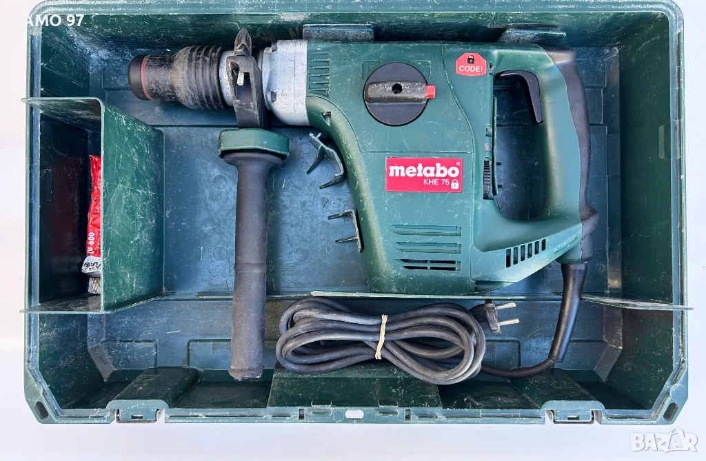 Метабо с потенциометър за регулиране на мощността. Машината има леки козметични забележки от използване, но си работи отлично без никакви проблеми и странични шумове, внос от Франция. Обявената цена включва машината с ръкохватка, грес за консумативи и оригинален куфар.