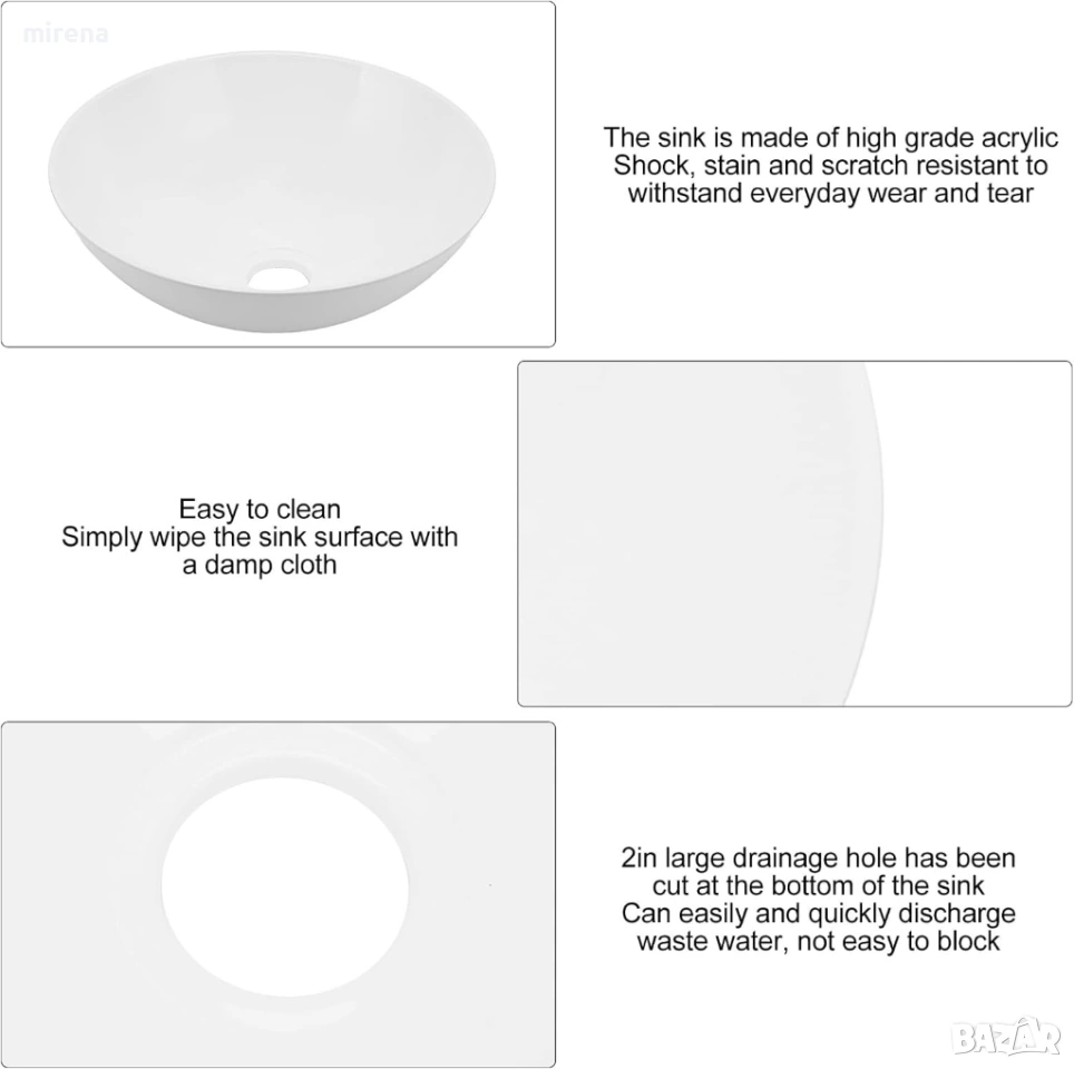 Удароустойчив дизайн: Изработена от висококачествен акрил, тази мивка за плот е проектирана да издържа на ежедневно износване и да гарантира нейната издръжливост за дългосрочна употреба.