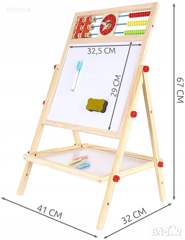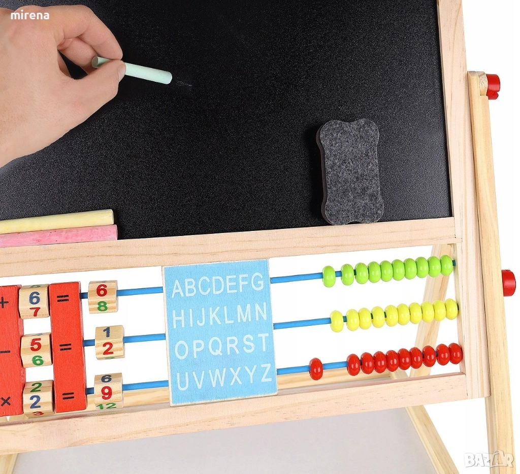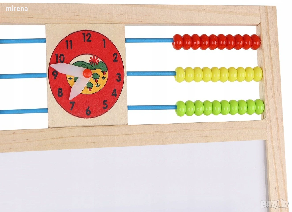 Дъската има класическо сметало с мъниста, с което децата могат да се научат да броят, а след това и да извършват основни математически операции като събиране, изваждане и умножение. Има и часовник, на който можете свободно да настройвате часа и децата да се научат да разпознават времето.