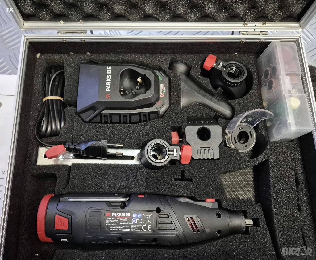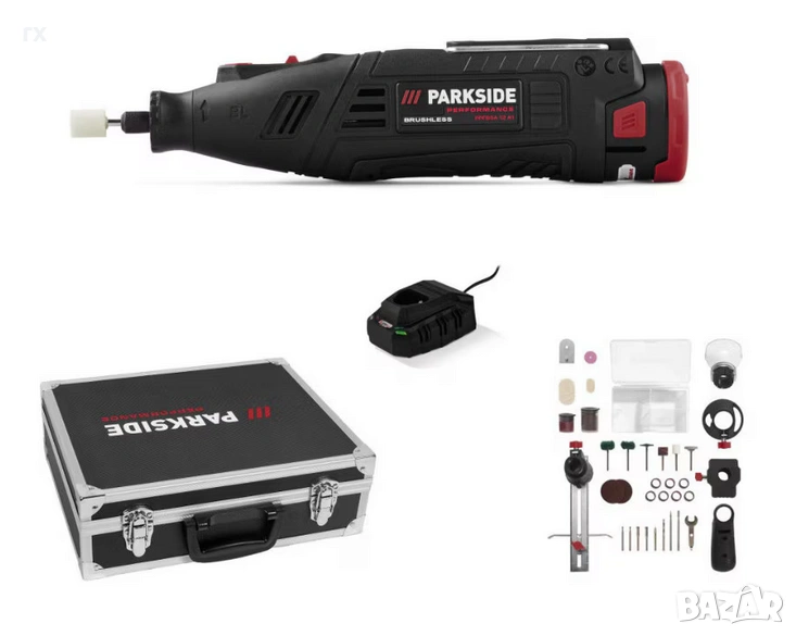 Ротационен инструмент (дремел) от серията Parkside Performance, модел PPFBSA 12 B2. Уредът е с безчетков мотор за по-дълъг живот и по-голяма мощност.