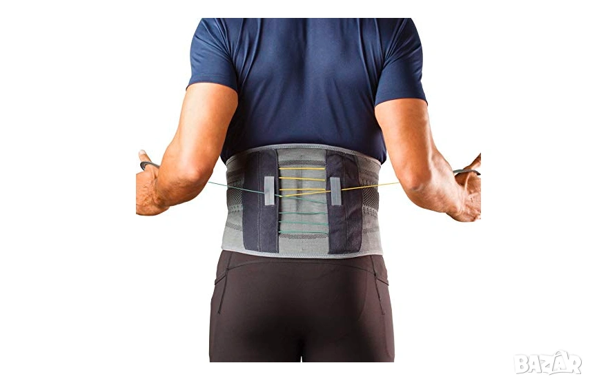 Ортеза за лумбална опора, изработена от полуеластичен текстилен материал, с множество стабилизиращи и подсилващи елементи, две макари като поддържащ колан, подвижна лумбална подложка и предно закопчаване с кукичка.