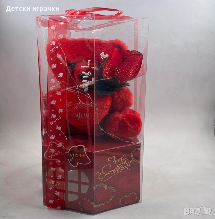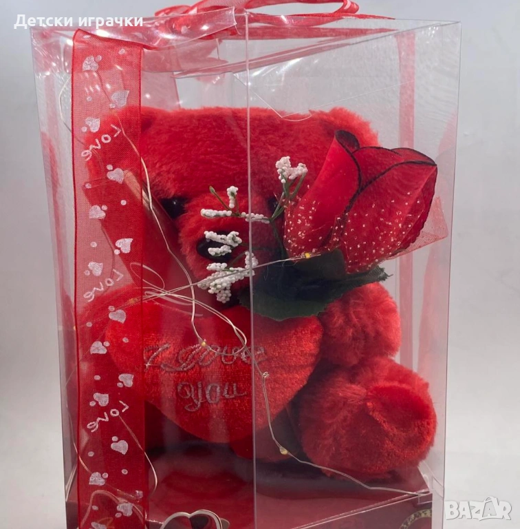 Плюшено мече с LED и сърце в прозрачна подаръчна опаковка, за Свети Валентин