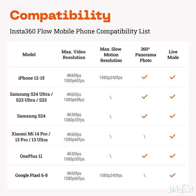 Insta360 Flow е стабилизатор на кардан, съвместим както с телефони с Android, така и с iPhone. Някои функции не са налични на всички смартфони с Android поради отворените протоколи на интерфейса на различните марки. Моля, проверете списъка със съвместимост в долната част на страницата.