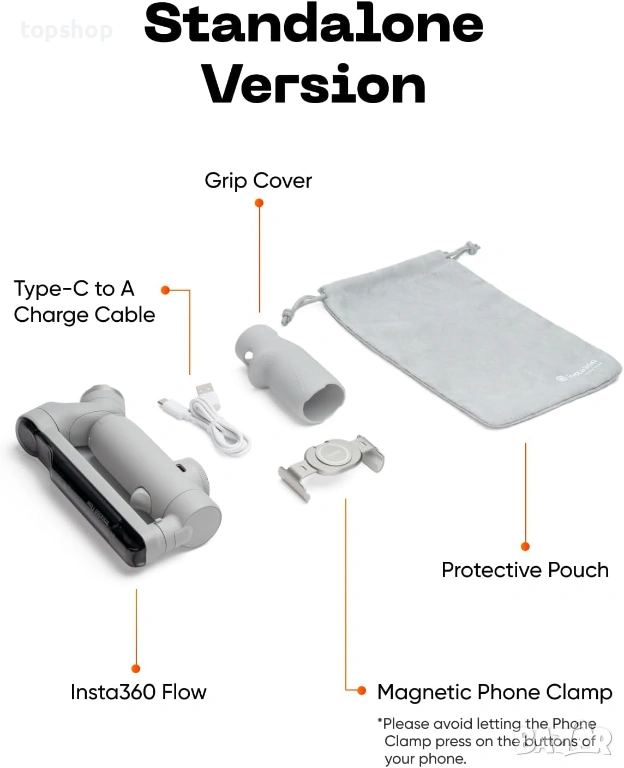Официалният комплект стикери включва 1x стабилизатор за Insta360 Flow, 1x защитен калъф, 1x магнитна скоба за телефон, 1x капак за захващане, 1x кабел за зареждане Type-C към A и 1x официален стикер.
