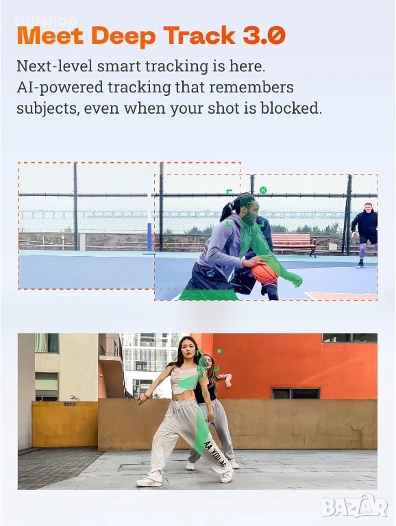 Deep Track 3.0 (AI проследяване): Изкуственият интелект следи обектите с невероятна точност. Дори обекът да се скрие за момент, гимбалът го "намира" отново веднага.