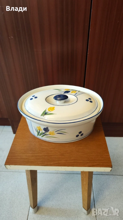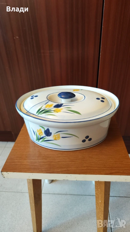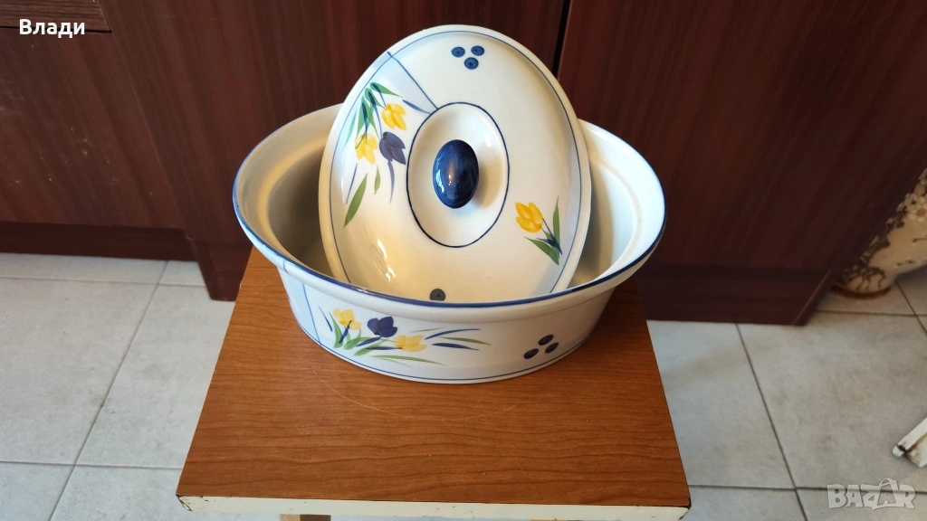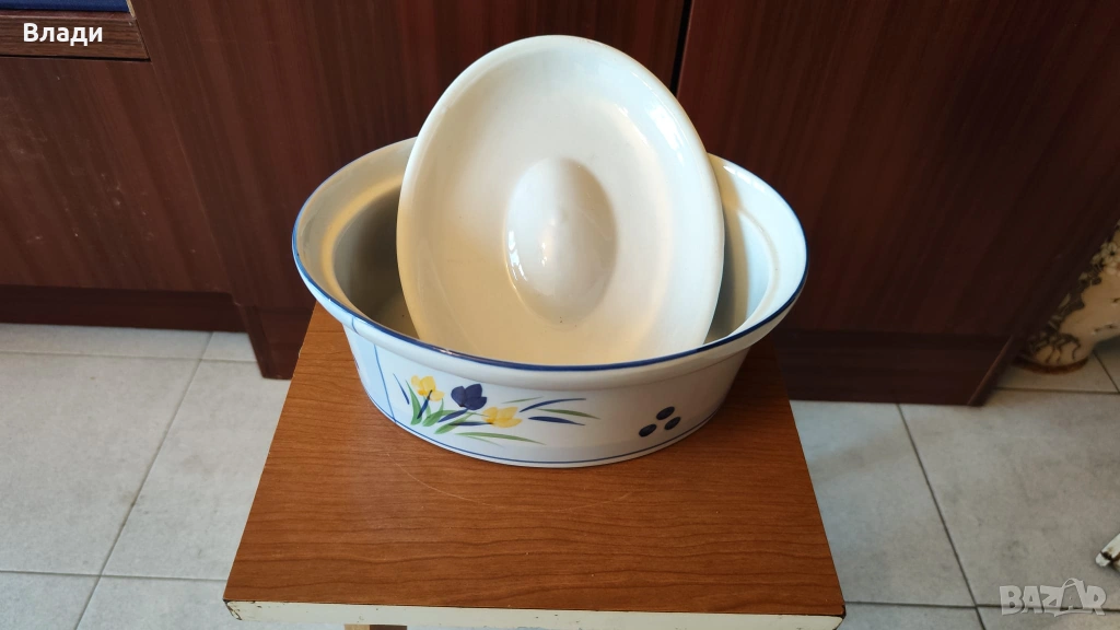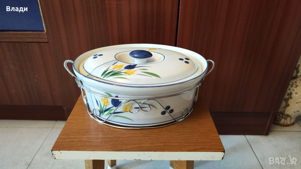 Нов порцеланов овален гювеч с капак и метална поставка – перфектен за автентични ястия, които се приготвят и сервират в същия съд.Овалната форма е идеална за пълнени чушки, тиквички или цели малки птичета, а порцеланът осигурява равномерно задържане и разпределение на топлината. Металната поставка предпазва масата и добавя стабилност, а плътният капак запазва сочността и ароматите.