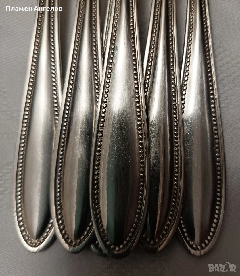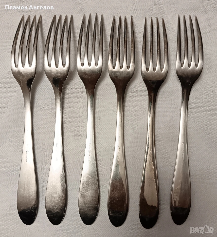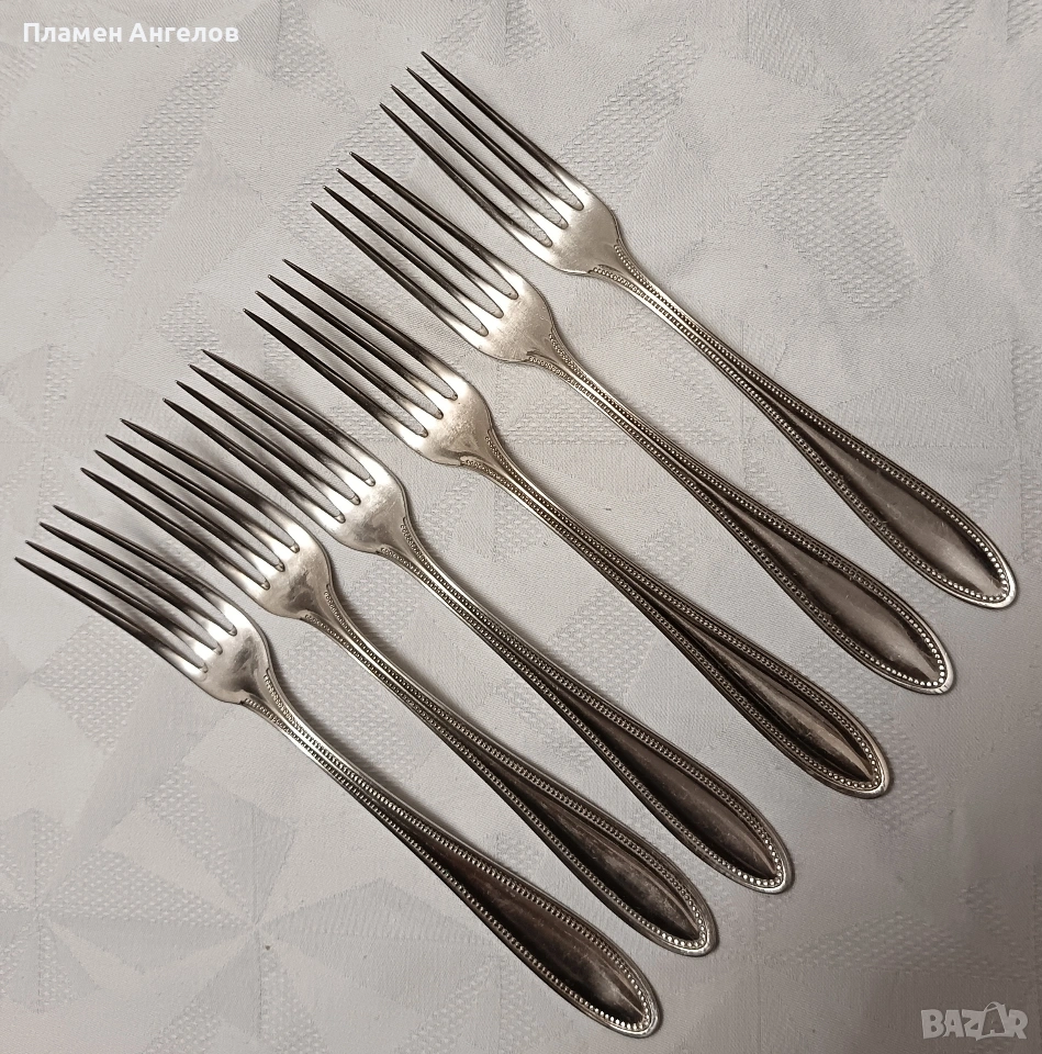 Винтидж, антикварен комплект вилици от 6 броя с маркировка на немската компания "VLIESS C&L ALPACCA" показва, че са изработени от първокачествена стомана 18/10 "никелово сребро" Разполагат със перлен кант по дръжките, характерен за периода Арт Деко от 1900-2920година. Вилиците са в отлично състояние без следи от годините. Дължина 20.5см.