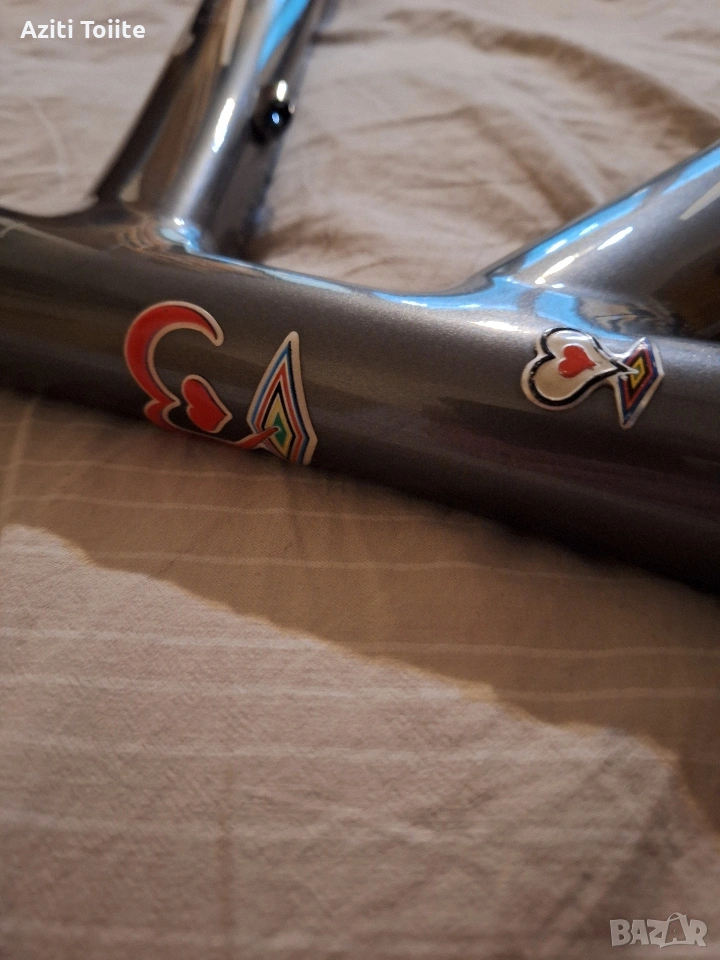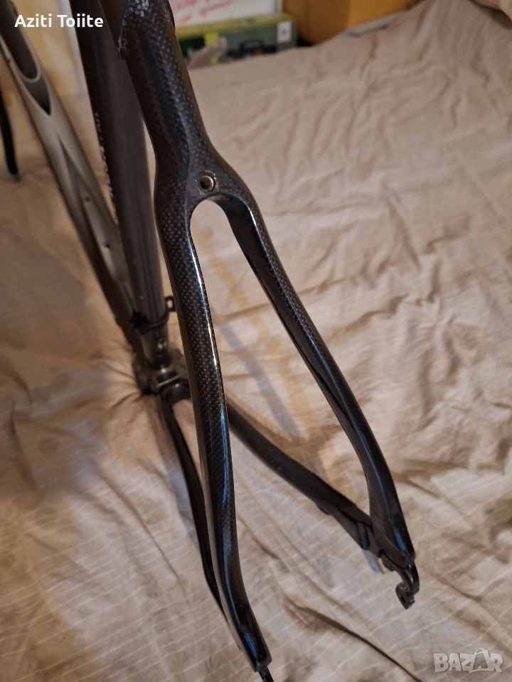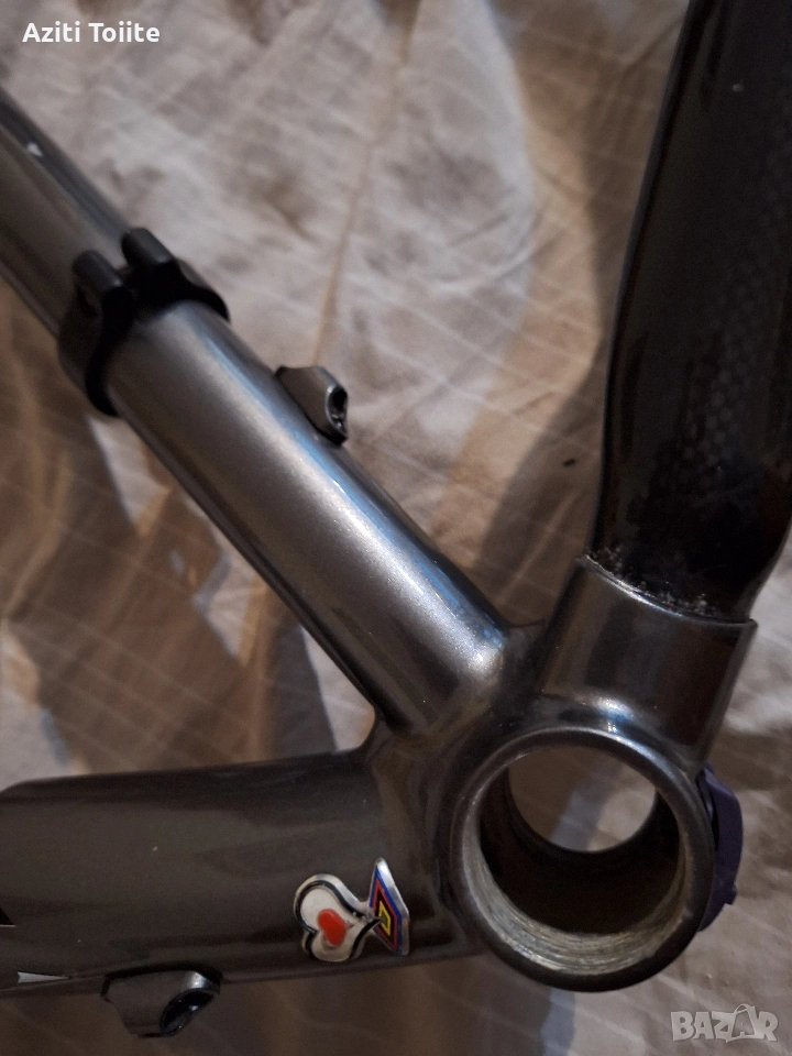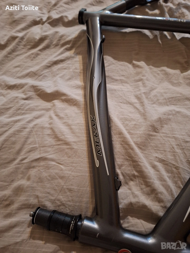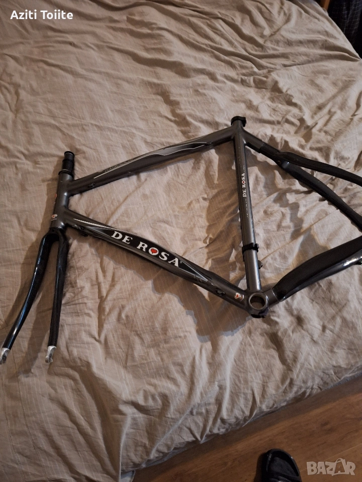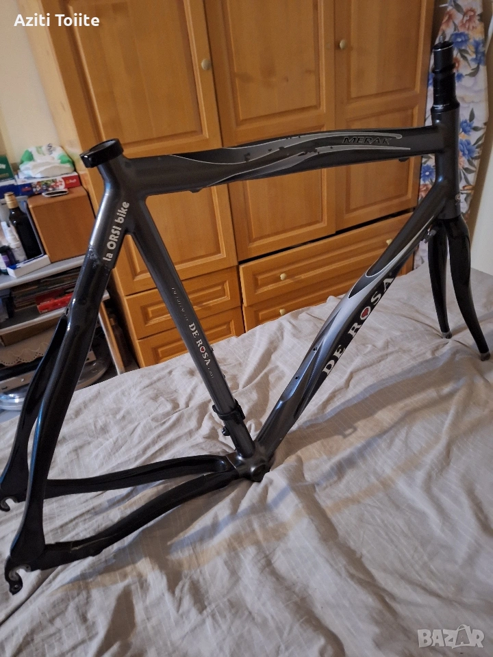 Алуминиева с предна и задна вилка карбонови.Модела е от края на 90 те-началото на. 2000 г.Това е най високият клас алуминиеви на de rosa.Размера е 58 и.Перфектно състояние с дребни козм.забележки.Чашките са chorus.Продава се в комплект както е на снимките-рамка,вилка,чашки спейсъри,скоба за сед.тръба,клампа за преден дерайлйор.За сед.колче 31.6 мм.За договаряне на цена само по телефона.На съобщения не отговарям.