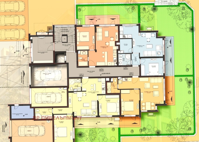 Апартаментът се намира на първия етаж със самостоятелен двор. Разпределението е входно антре, хол с кухненски бокс с излаз към двора, самостоятелна спалня и баня с тоалетна в едно.