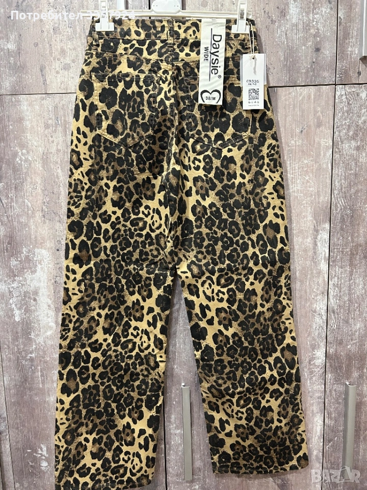 Продавам чисто нови еластични дънки с леопардов принт. М-размер с висока талия.