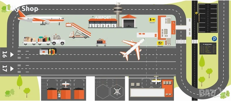 Стикер „Летище“ Играта с колички и самолетчета е още по-забавна с тази сладка игрална подложка с летищна тематика! Тя стимулира въображението на децата и е подходяща както за игра в седнало, така и в изправено положение.