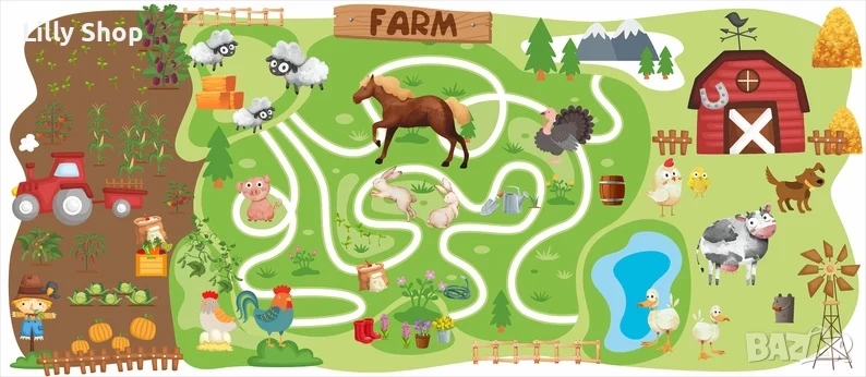 Веселия лабиринт представя на децата животните във фермата – кон, овце, патици, пуйка и кокошки. Множеството елементи, свързани с живота извън града, задържат вниманието на детето и стимулират любопитството му да открива нови и интересни обекти.