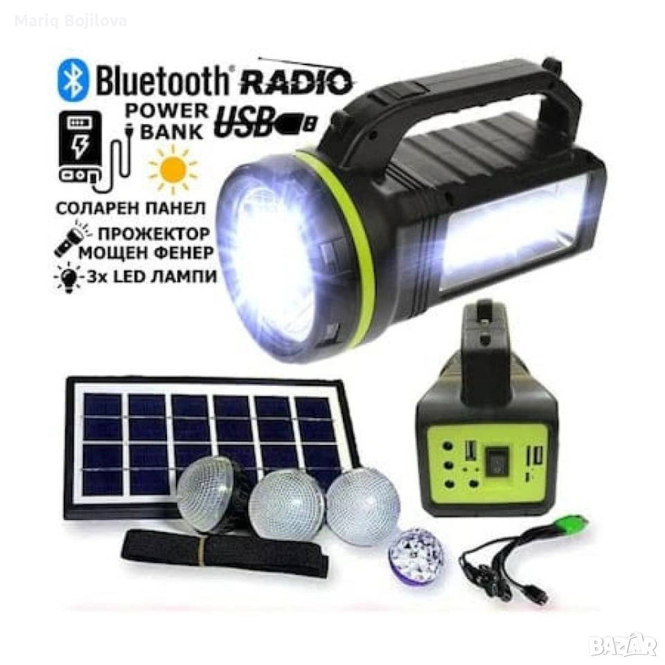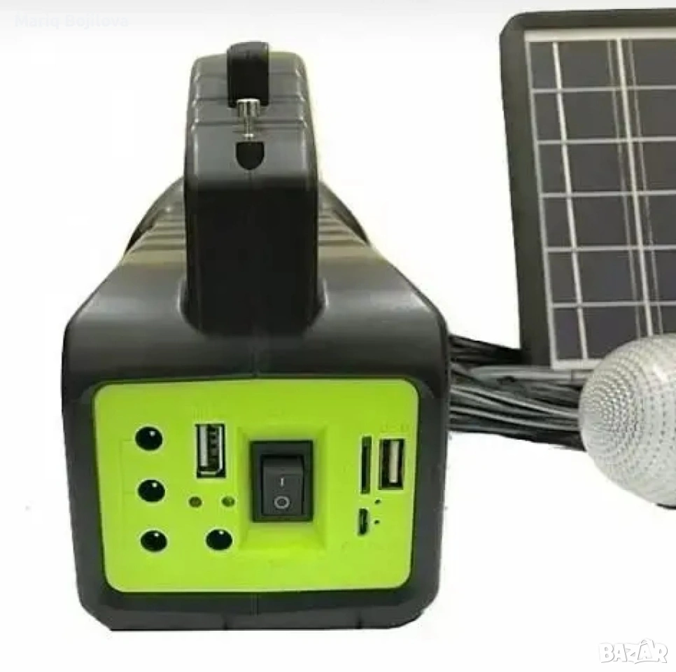 💡Преносима соларна станция (фенер) GDLITE GD-2000A + слънчев панел + 3 лампи Капацитет на батерията: 9000 mAh; Входно напрежение: 5 V DC, 220 V AC Изходно напрежение: 3 изхода 6 V, 1 изход USB: 5 V, 0,5 A; Време за зареждане: 10-15 часа от мрежата, 12-16 часа от слънчева батерия; Индикатор на нивото на заряда на батерията; Аварийна LED лампа; ⚜️Слънчева батерия; Размери: 22,5 x 9,5 x 9 см; Фенер: Фенерът е снабден с мощна LED лампа, която осигурява ярко и равномерно осветление. Има 3 режима на осветление: силно, слабо и мигащо; Слънчев панел: Слънчевият панел зарежда батерията на станцията, така че можете да използвате фенера дори когато няма електричество; 3 лампи: Трите лампи могат да се използват за осветление на палатки, каравани или други помещения; 💰Цена:51.83лв/26.50€