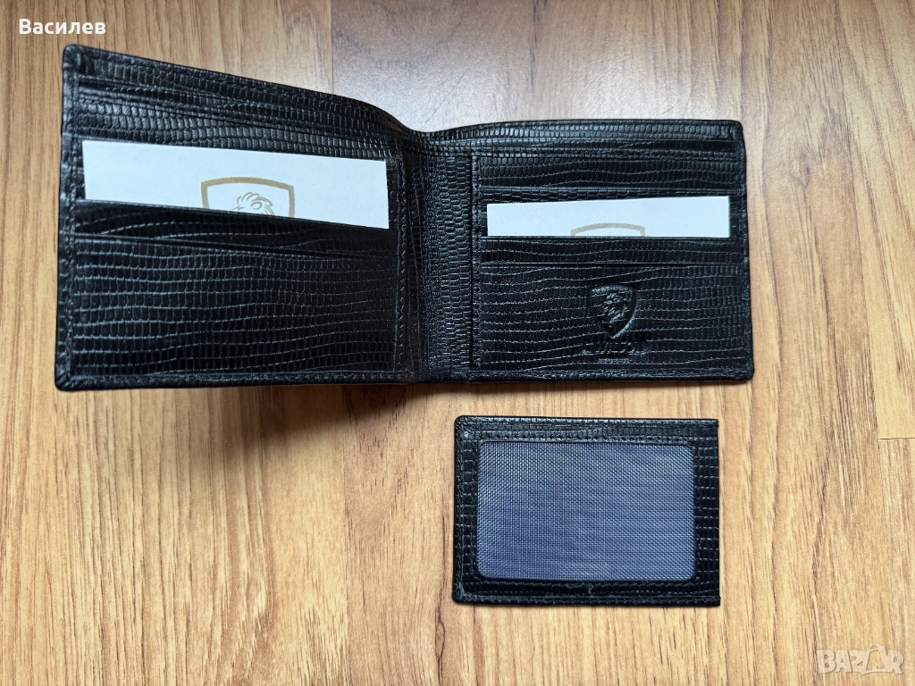 Нов, мъжки портфейл J. Wilson, внос Англия. Изработен от мека и фина естествена кожа. Разполага с 8 слота за кредитни и дебитни карти, 2 основни отделения за банкноти. Отделен кейс за лична карта. Размери 11,5X9,3 см, цвят черен.